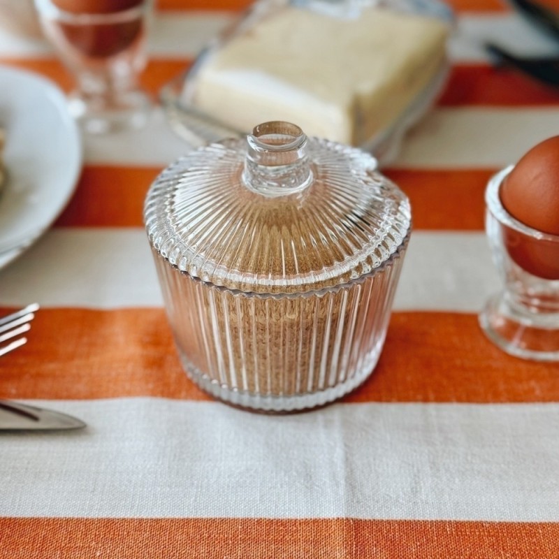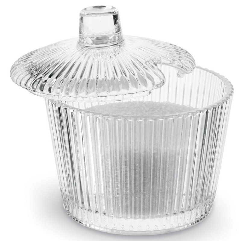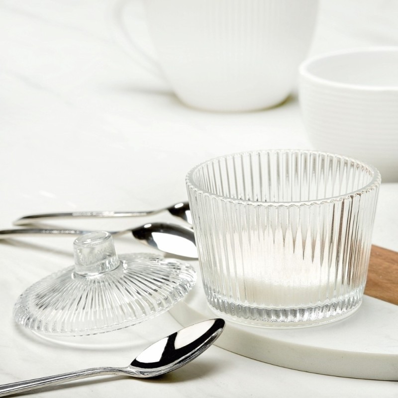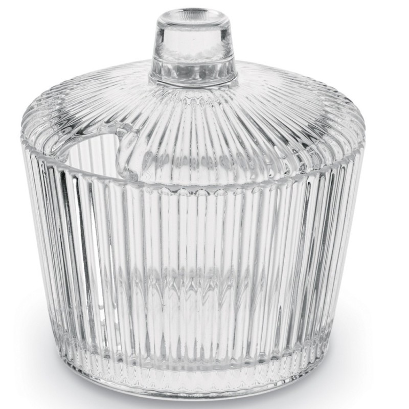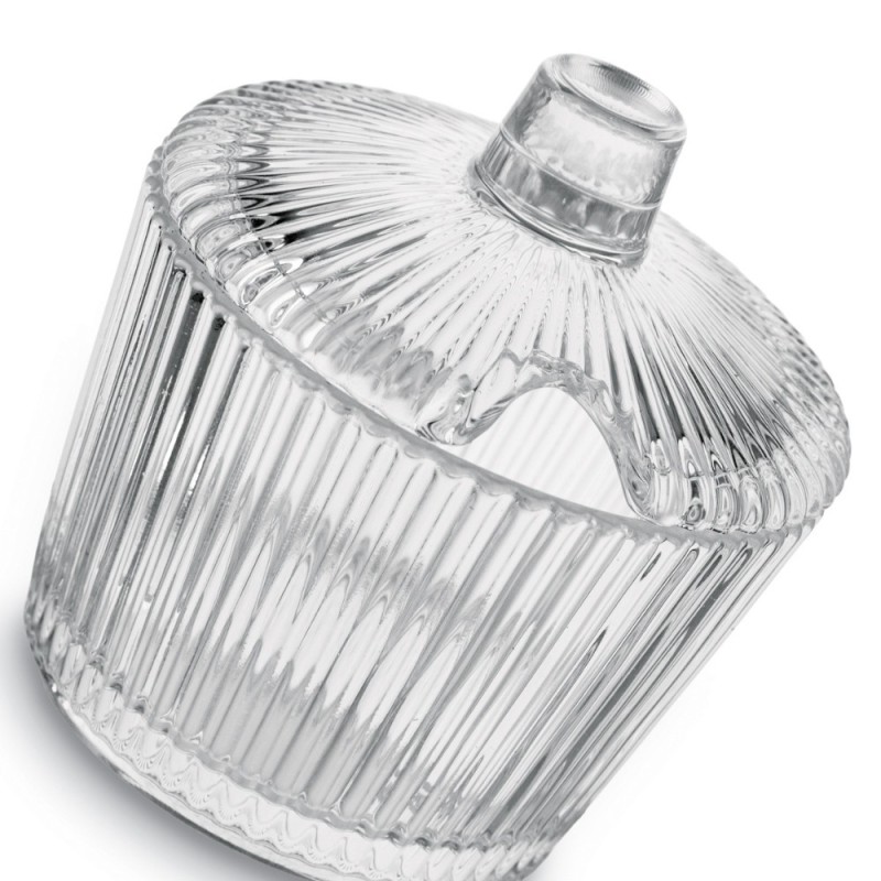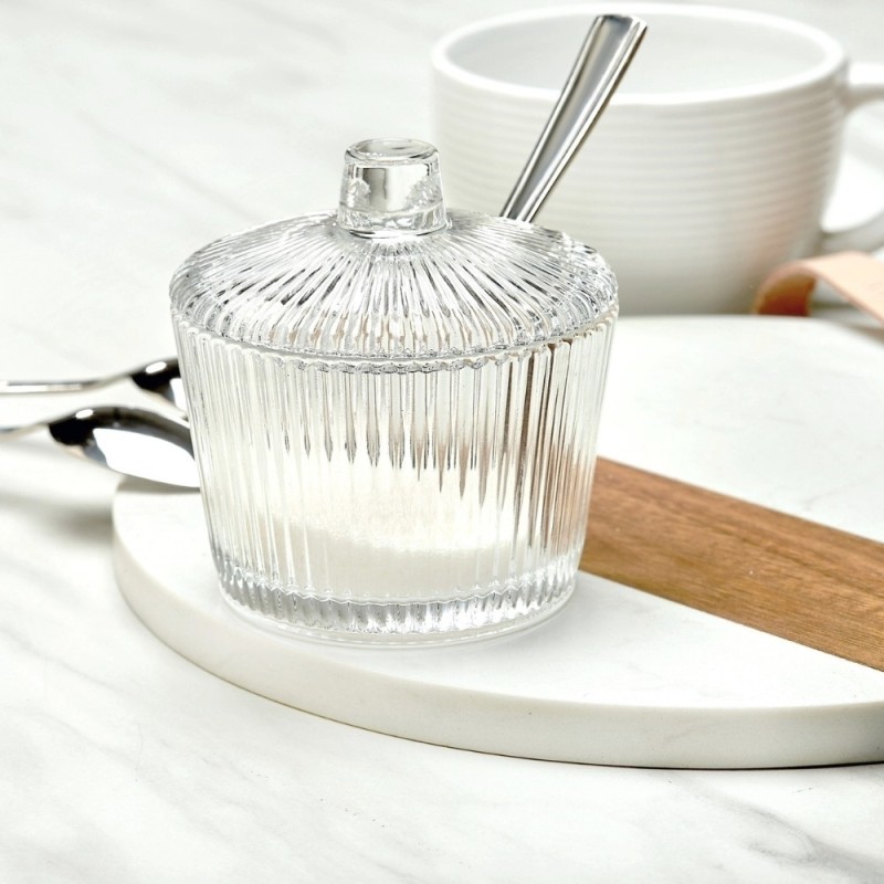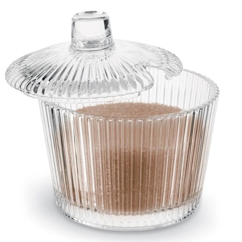 Szklana budowa idealnie wpisuje się w domową estetykę – pięknie załamuje światło, eksponując kryształki cukru. Cukiernica świetnie komponuje się z porcelanową zastawą deserową oraz filiżankami w stylu retro lub nowoczesnym.