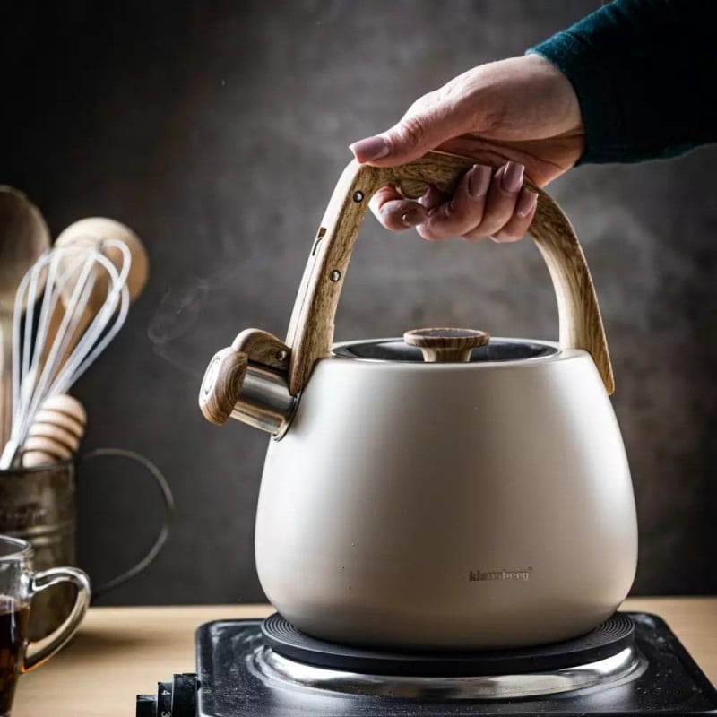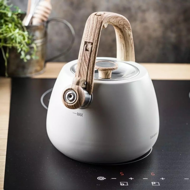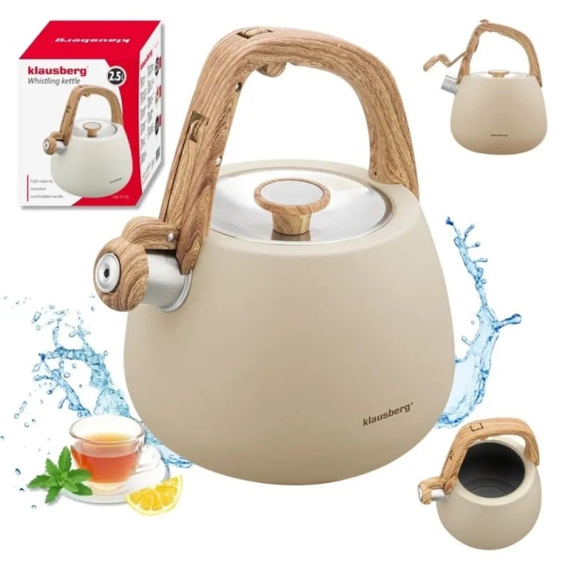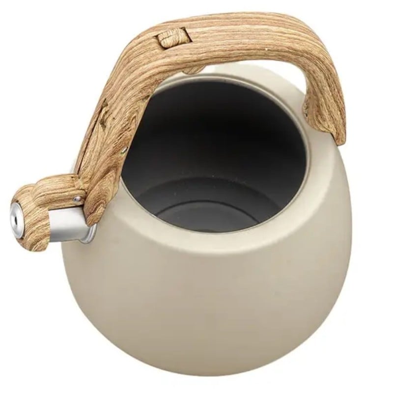 Czajnik tradycyjny łączy klasyczną funkcję z estetyką, która dobrze odnajduje się w nowoczesnej i naturalnej kuchni. Beżowe wykończenie, uchwyt w kolorze drewna i stal nierdzewna tworzą spójną, elegancką całość, a pojemność 2,5 l sprawia, że model dobrze sprawdza się w codziennym użytkowaniu.