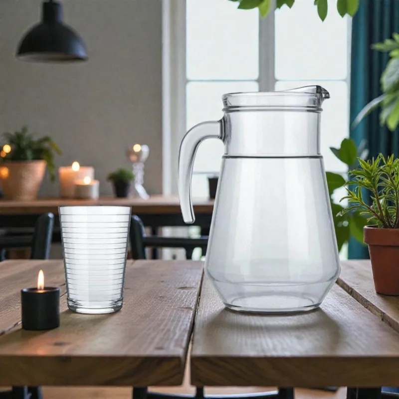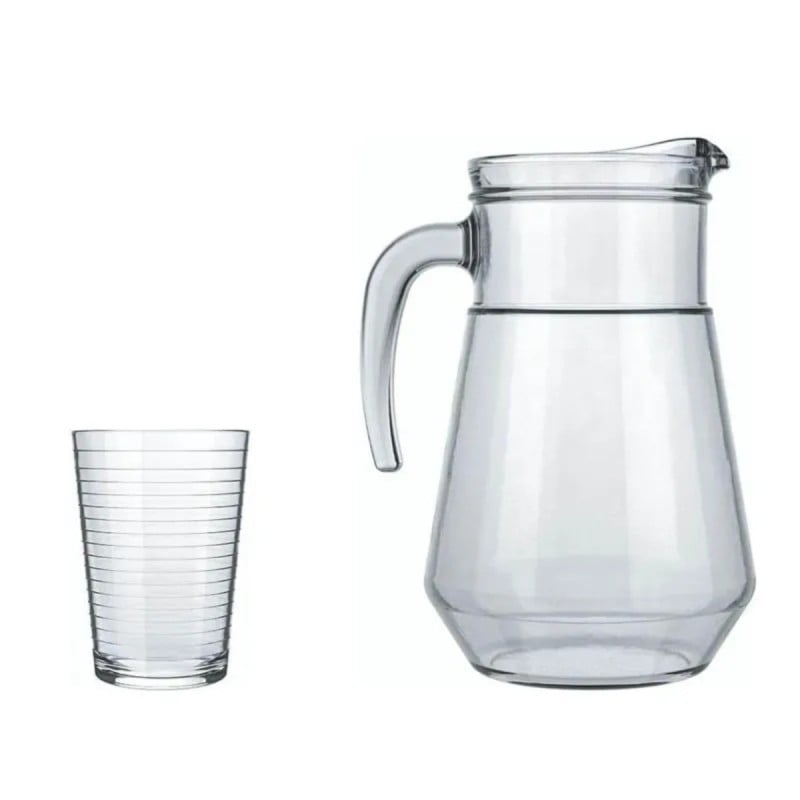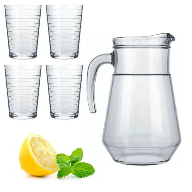 Stylowy i funkcjonalny zestaw dzbanka o pojemności 1,5L z czterema szklankami 265ml to idealne rozwiązanie do codziennego serwowania napojów w domu, ogrodzie czy podczas rodzinnych przyjęć. Dzbanek wykonany z wytrzymałego, przejrzystego szkła jest lekki, poręczny i trwały, co czyni go doskonałym wyborem do użytku zarówno wewnątrz, jak i na zewnątrz.