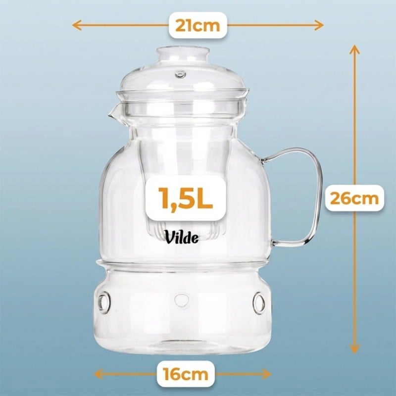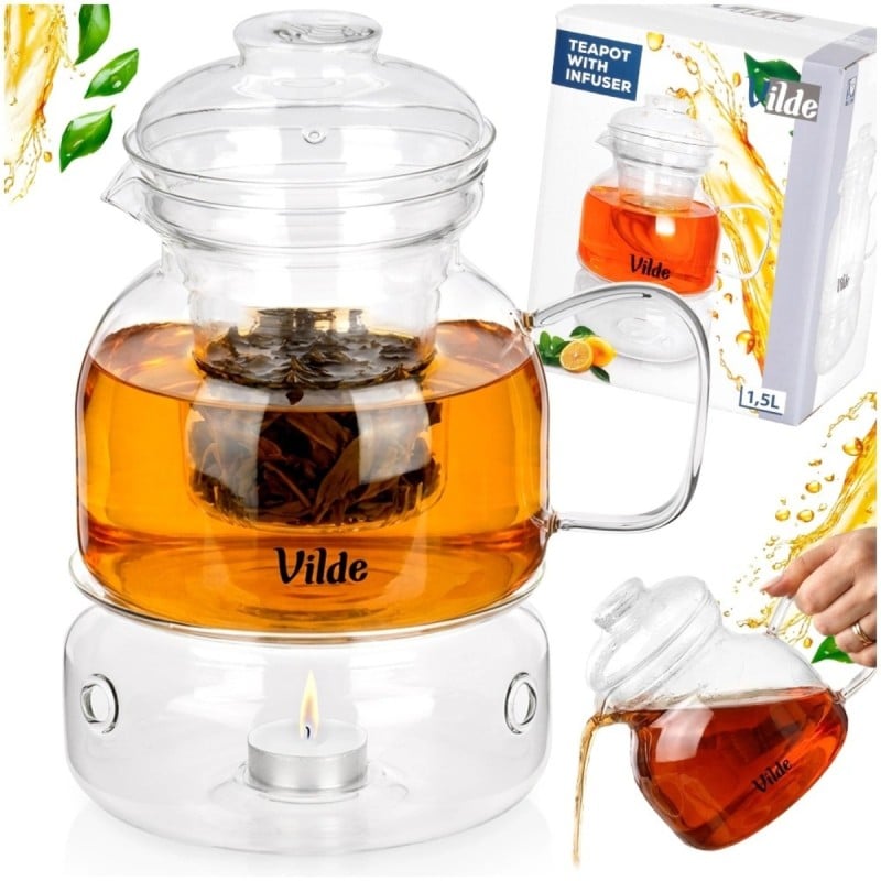 Elegancki zestaw do parzenia herbaty i ziół składający się ze szklanego dzbanka, zaparzacza oraz podgrzewacza. Pojemność 1,5 l pozwala przygotować większą ilość naparu dla kilku osób. Podgrzewacz ze świeczką typu tealight pomaga utrzymać temperaturę napoju podczas serwowania.