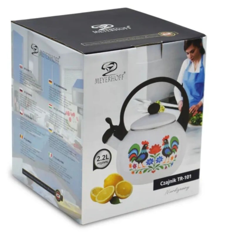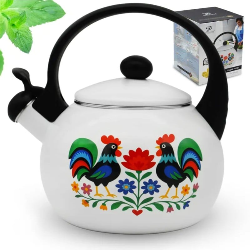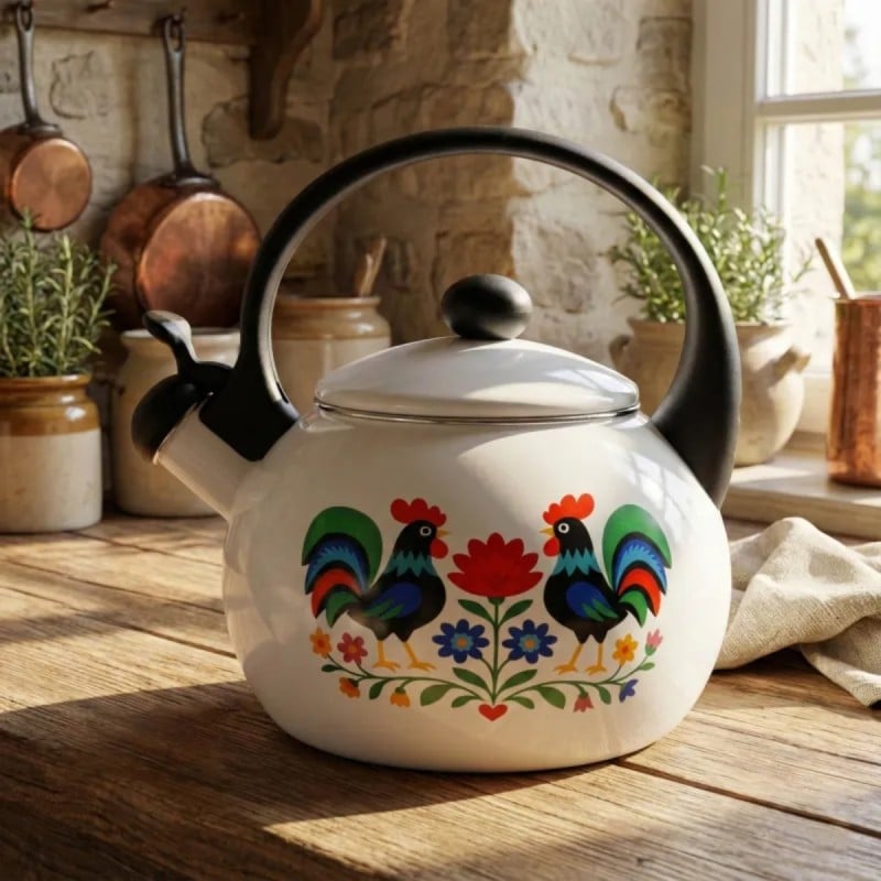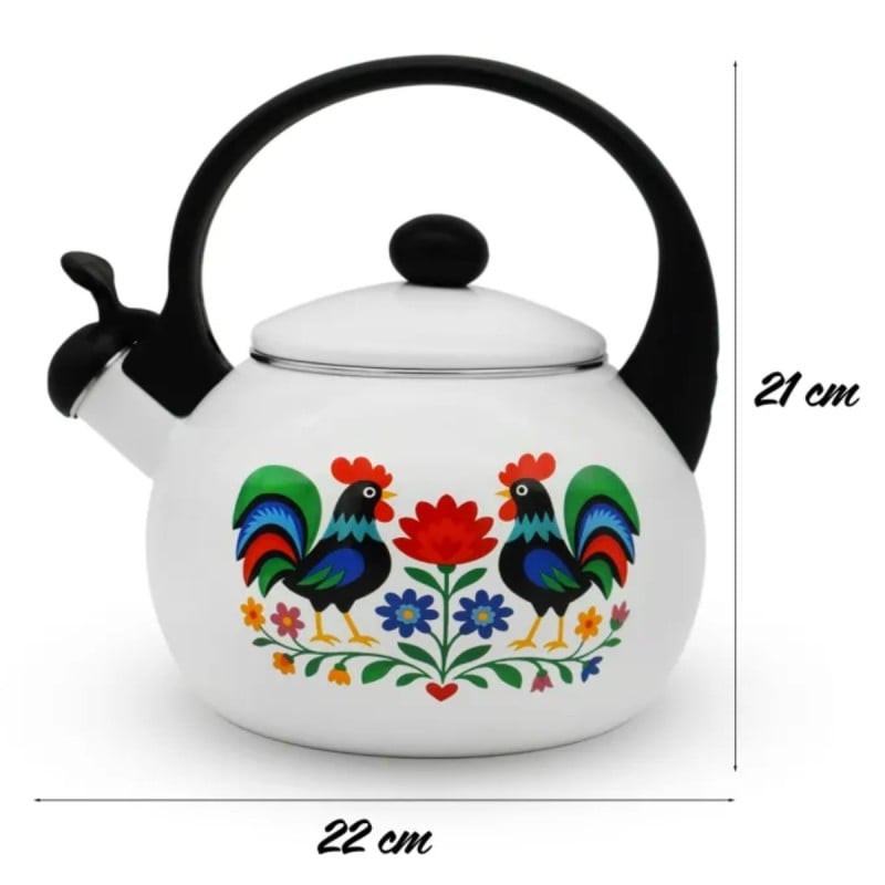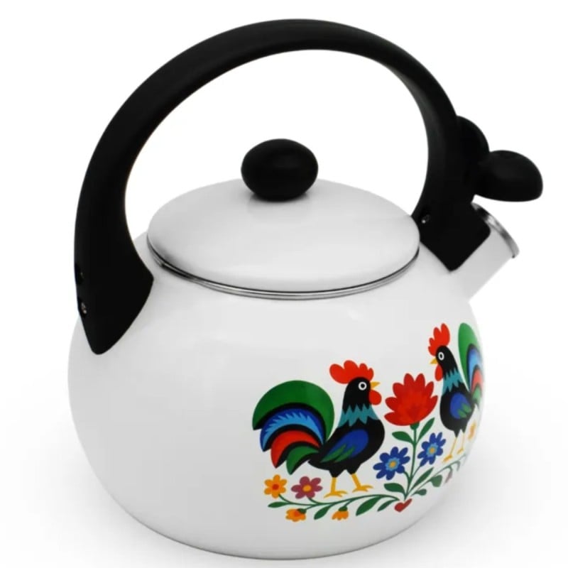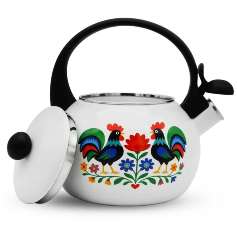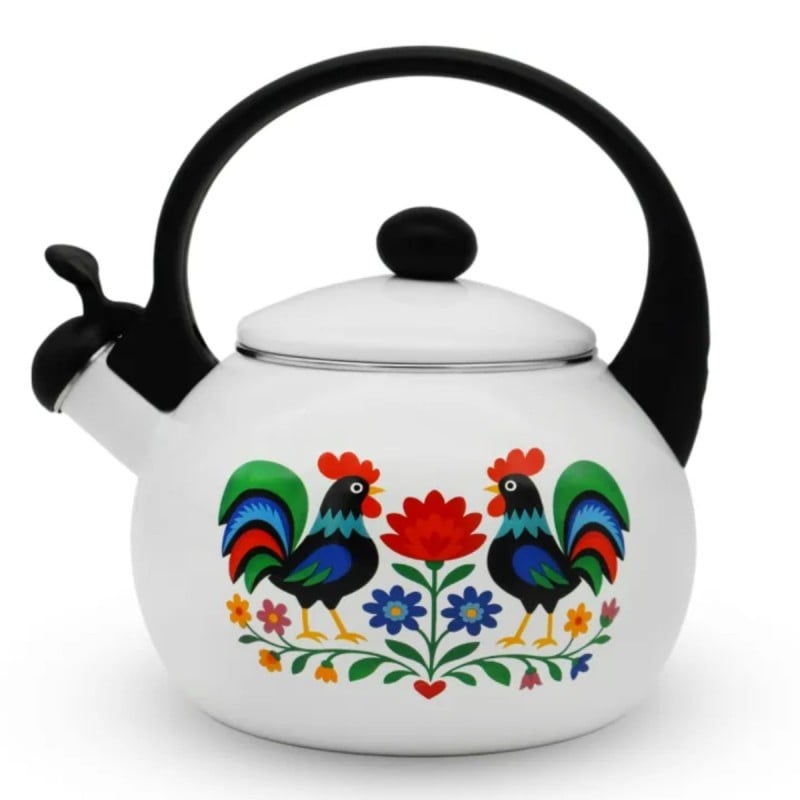Biała emalia w połączeniu z folkowym wzorem tworzy spójną i elegancką całość. Czajnik doskonale pasuje do jasnych, klasycznych kuchni, ale dobrze odnajdzie się również w nowoczesnych wnętrzach jako kontrastowy akcent dekoracyjny. To propozycja dla osób, które cenią tradycyjne motywy w świeżym, estetycznym wydaniu.