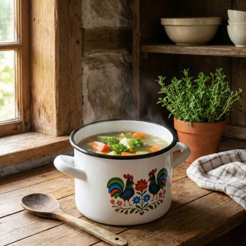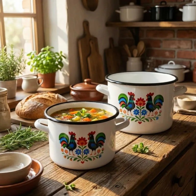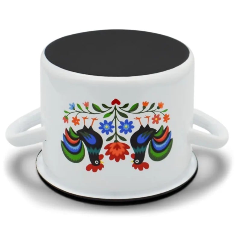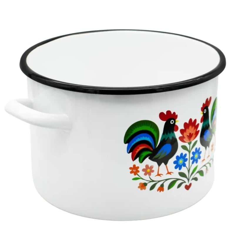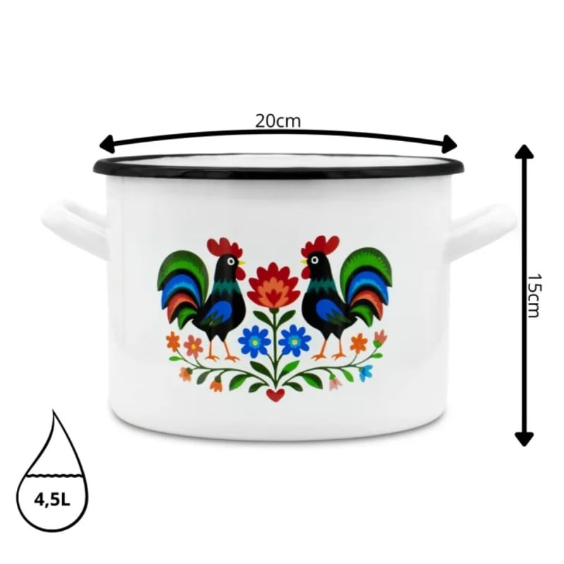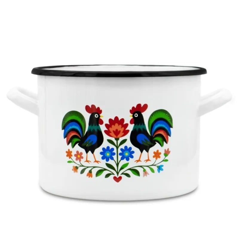 Dekoracyjny wzór inspirowany tradycją ludową sprawia, że naczynie wyróżnia się wyglądem i wnosi do kuchni bardziej przytulny charakter. Motyw kogutów i roślin na białym tle nadaje garnkowi wyrazisty styl, który dobrze komponuje się z klasycznym wyposażeniem.