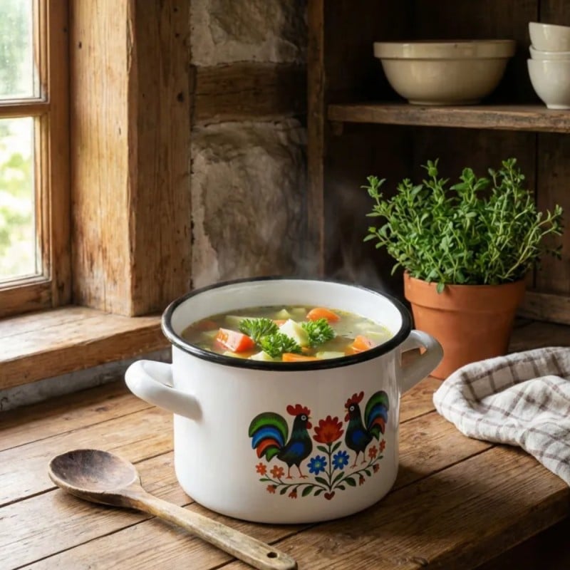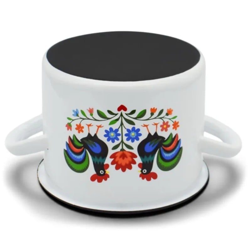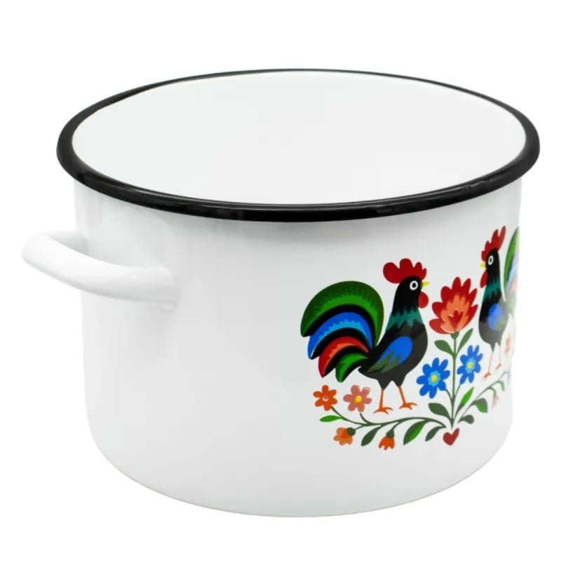 Dekoracyjny wzór inspirowany tradycją ludową sprawia, że naczynie wyróżnia się wyglądem i wnosi do kuchni bardziej przytulny charakter. Motyw kogutów i roślin na białym tle nadaje garnkowi wyrazisty styl, który dobrze komponuje się z klasycznym wyposażeniem.