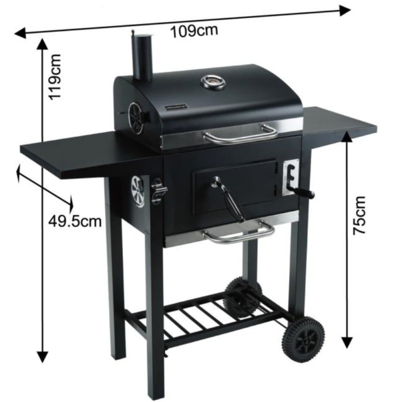 - Stalowa konstrukcja - grill został wykonany ze stali malowanej proszkowo, co zapewnia trwałość i odpowiednią wytrzymałość podczas użytkowania.