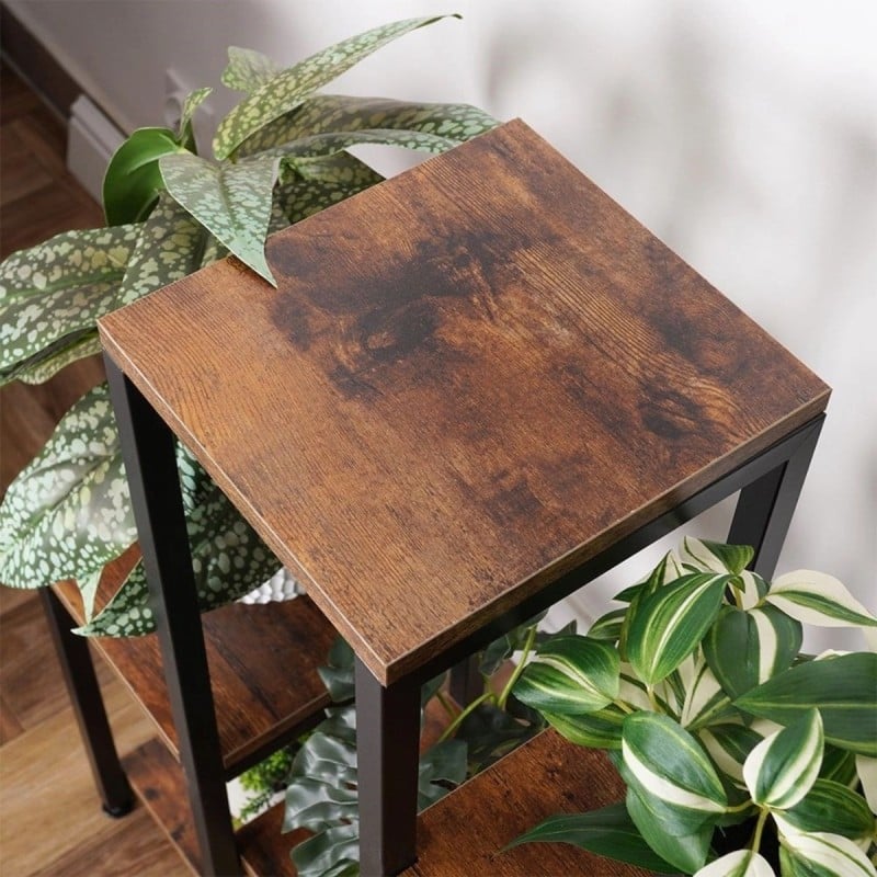 Czarny metalowy stelaż zestawiony z półkami o strukturze drewna tworzy wyraźny akcent loftowy. Kwietnik dobrze prezentuje się zarówno w nowoczesnych jak i bardziej klasycznych wnętrzach.
