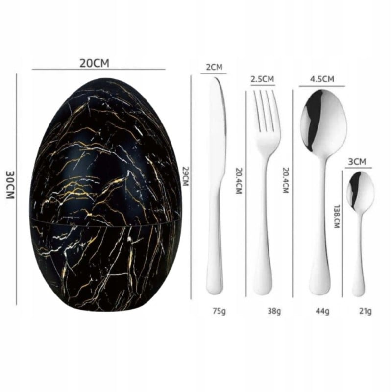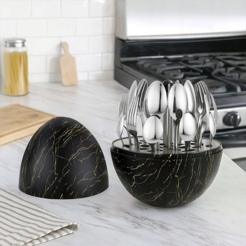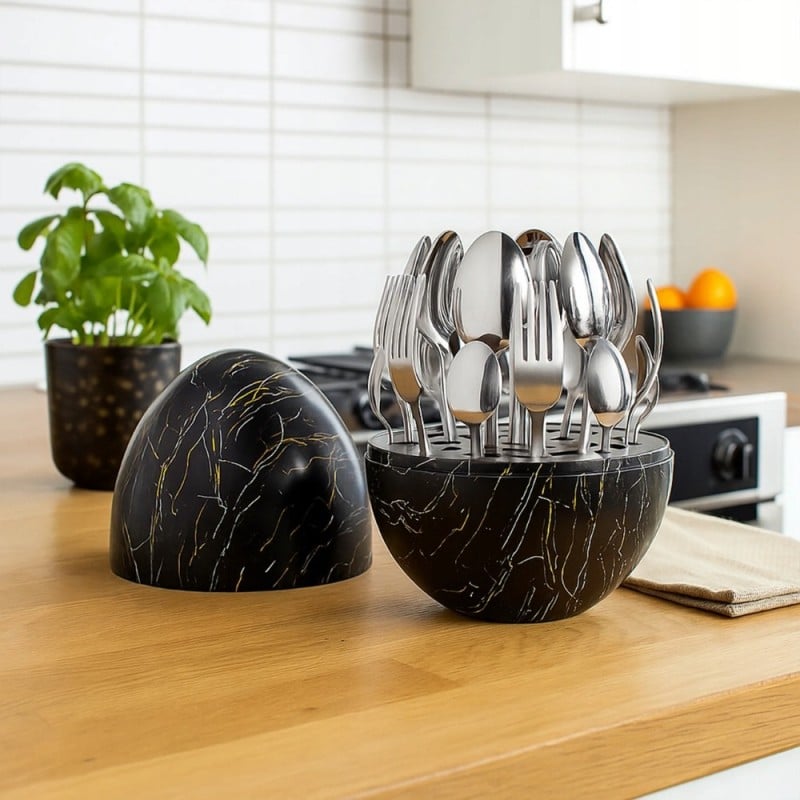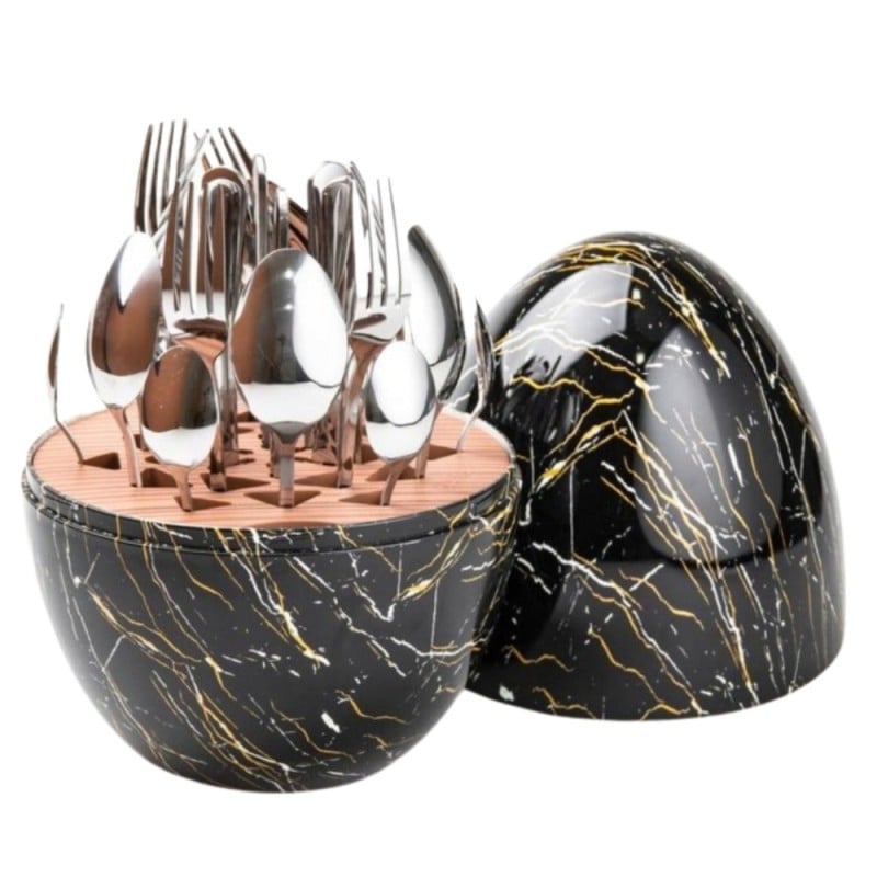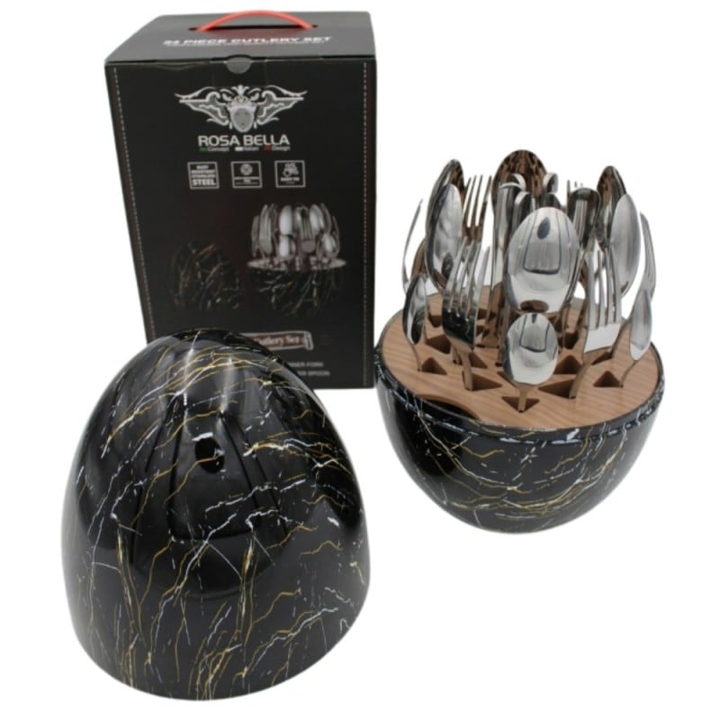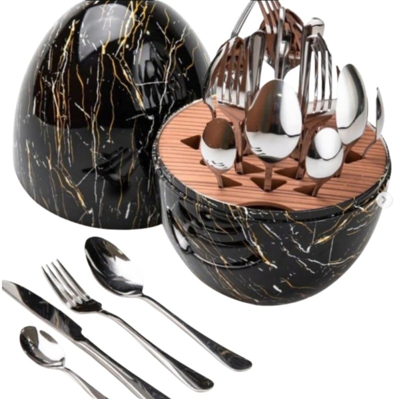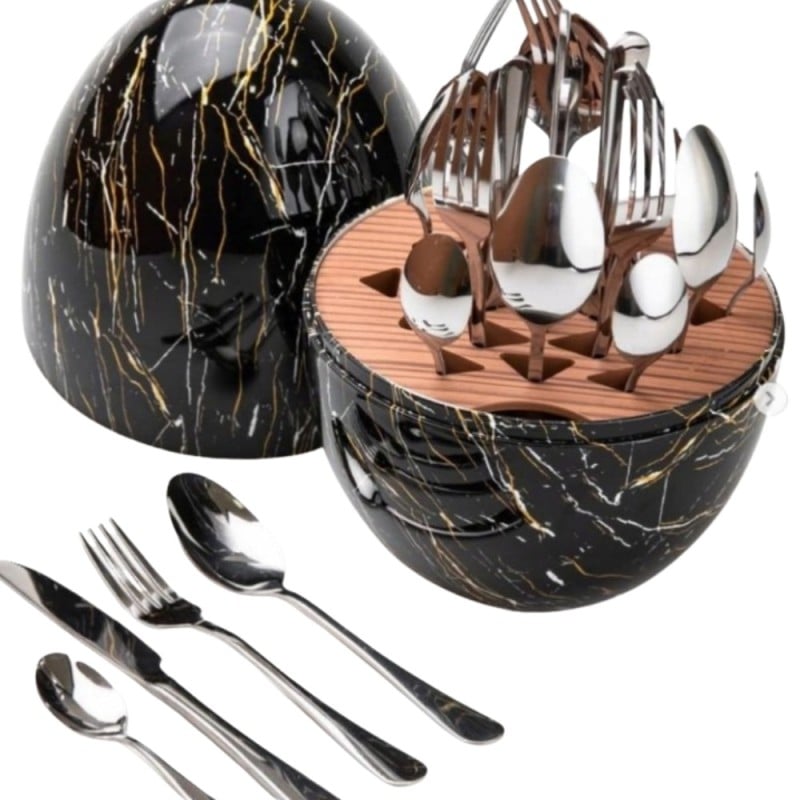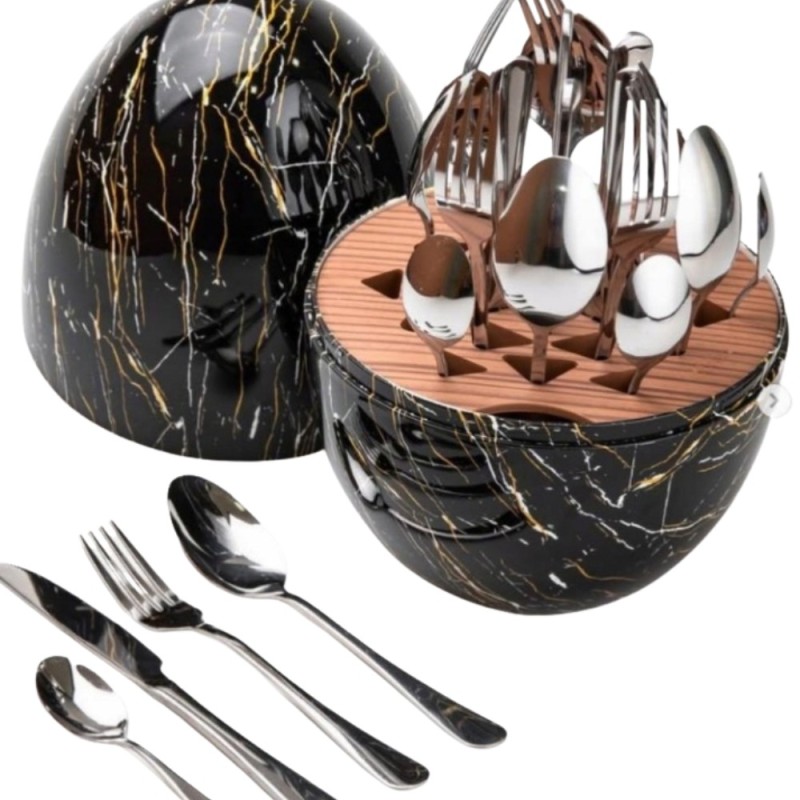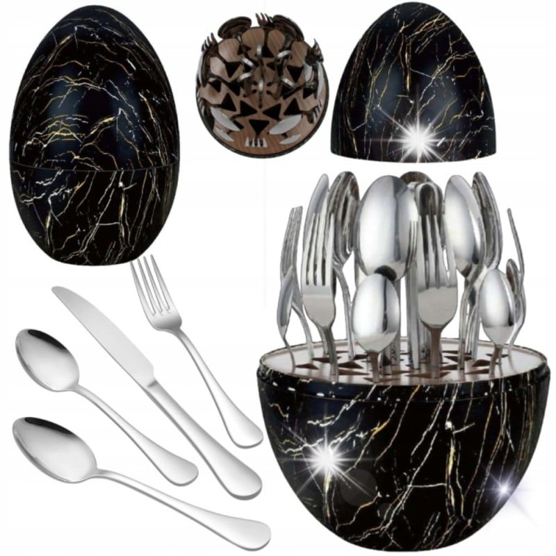 ✨ Odkryj Nowoczesny Styl: Zestaw Sztućców ROSA BELLA 24 elementy w Organizerze "Jajko" w kolorze czarnego marmuru