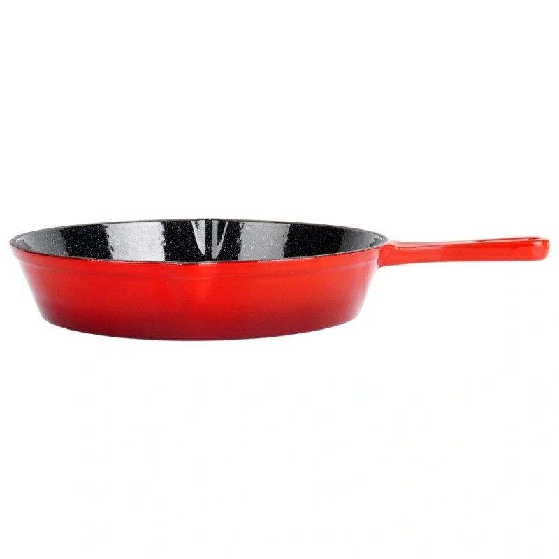 Solidna patelnia żeliwna o średnicy 25 cm z emaliowaną powłoką i silikonową nakładką na uchwyt. Przystosowana do wszystkich typów kuchenek oraz do użycia w piekarniku i nad ogniem. Dzięki właściwościom żeliwa równomiernie rozprowadza ciepło i długo utrzymuje temperaturę potraw.