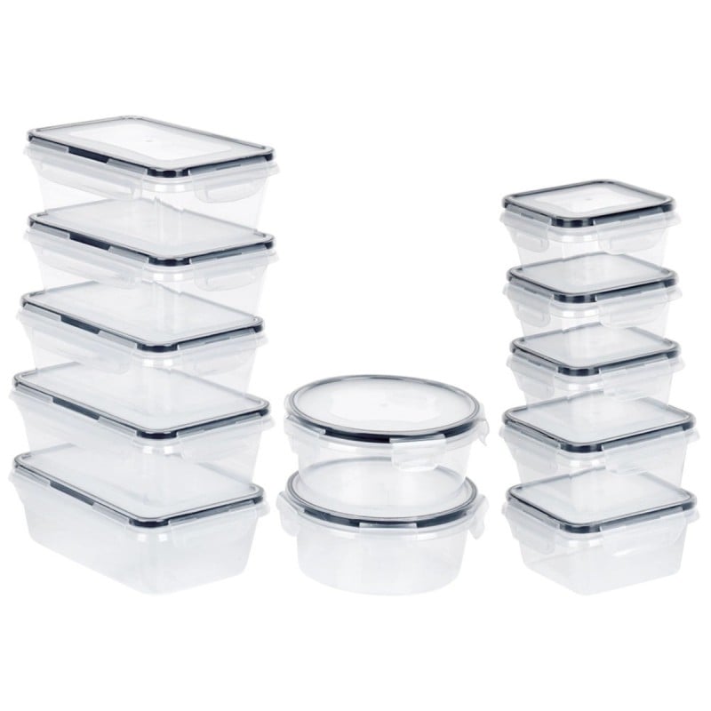 Zestaw zawiera pojemniki kwadratowe, prostokątne i okrągłe, dzięki czemu łatwo dopasować odpowiedni rozmiar do konkretnego produktu.