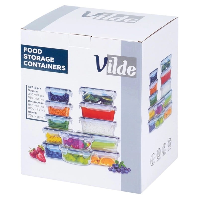 Zestaw 12 pojemników na żywność marki Vilde to praktyczne rozwiązanie do codziennego przechowywania i transportu jedzenia. Pojemniki wykonane są z wytrzymałego, przezroczystego tworzywa, które nie wchodzi w reakcję z żywnością i pozwala szybko sprawdzić zawartość bez otwierania.