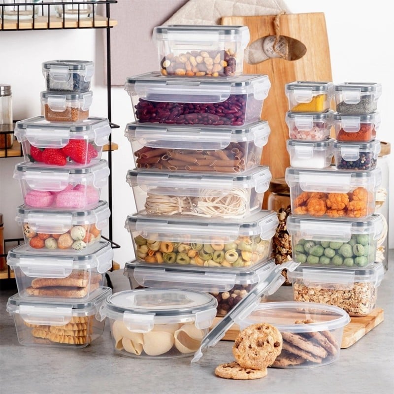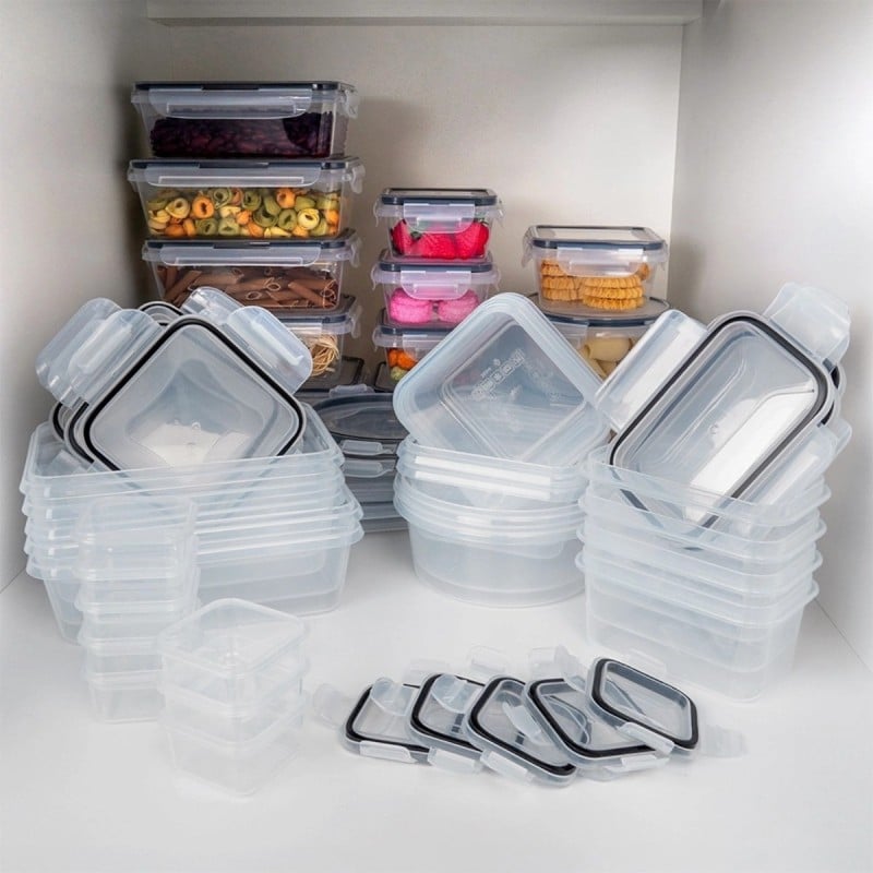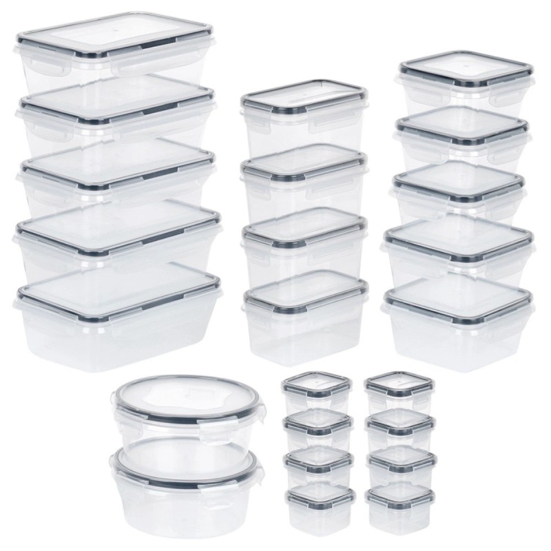 Zestaw zawiera pojemniki kwadratowe, prostokątne i okrągłe, dzięki czemu łatwo dopasować odpowiedni rozmiar do konkretnego produktu.