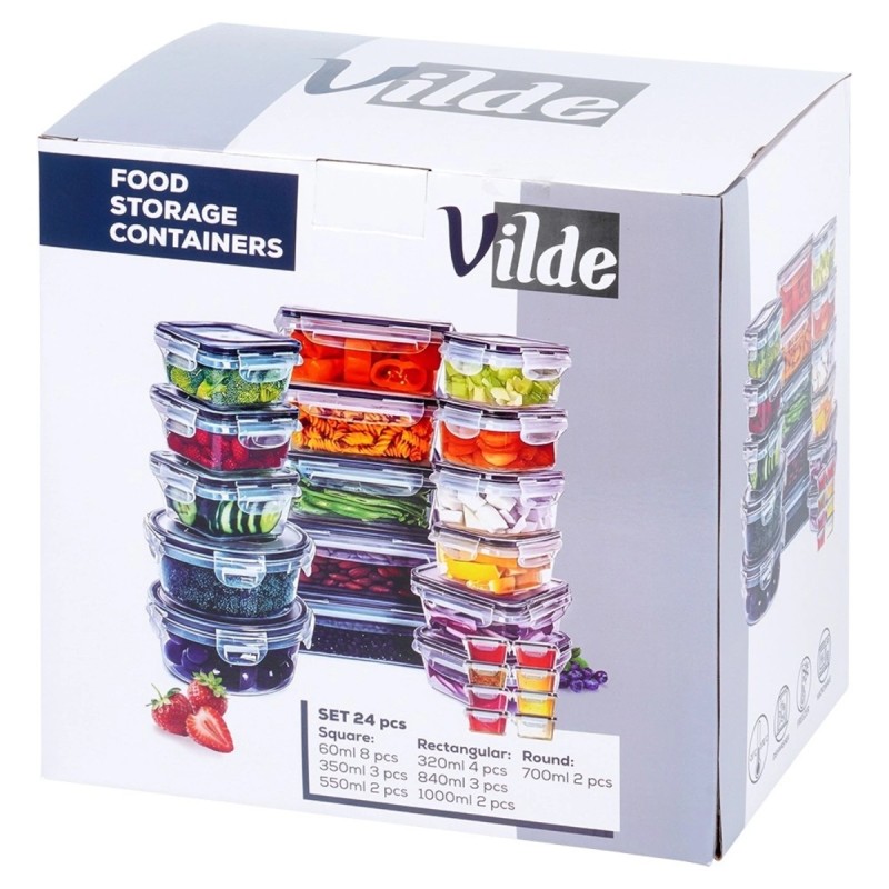 Zestaw 24 pojemników na żywność marki Vilde to praktyczne rozwiązanie do codziennego przechowywania i transportu jedzenia. Pojemniki wykonane są z wytrzymałego, przezroczystego tworzywa, które nie wchodzi w reakcję z żywnością i pozwala szybko sprawdzić zawartość bez otwierania.