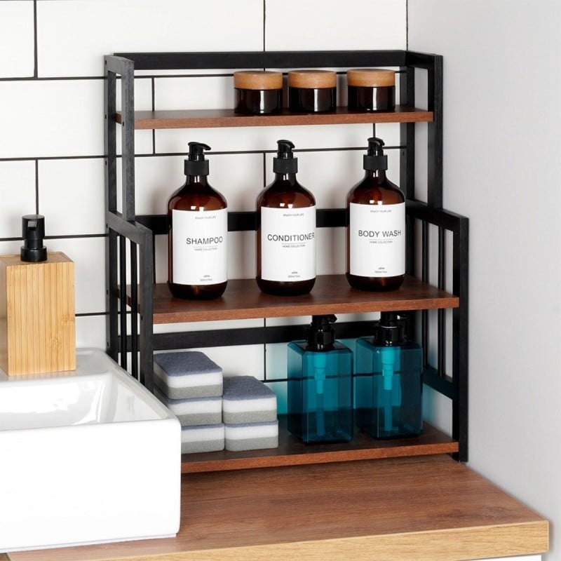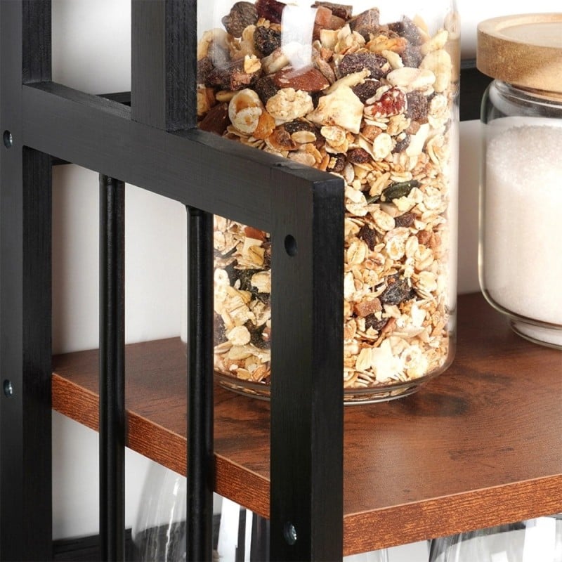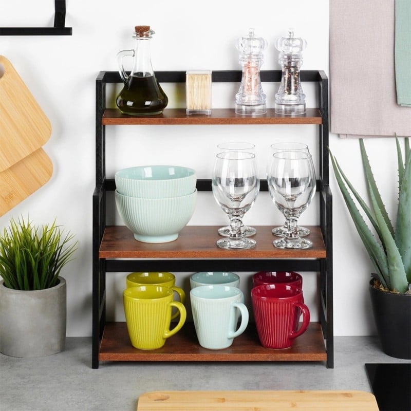 Praktyczna półka, która pomaga uporządkować blat bez zajmowania dużej ilości miejsca. Trzy poziomy pozwalają wygodnie rozłożyć przyprawy, kubki czy drobne akcesoria, a połączenie drewna i czarnej konstrukcji dobrze wpisuje się w nowoczesne kuchnie.