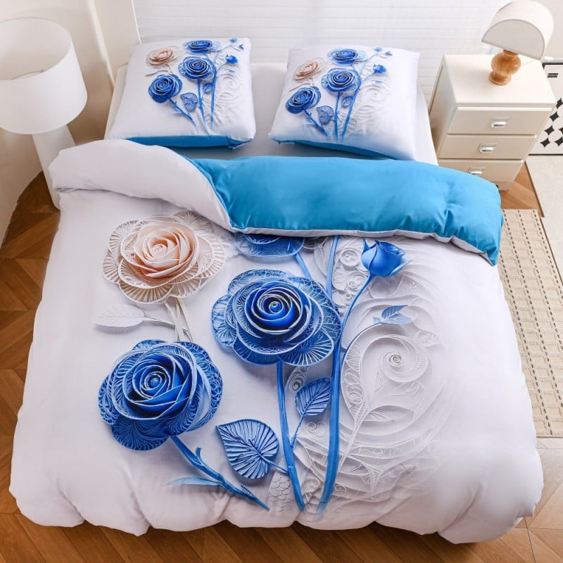 To pościel, która od razu przyciąga uwagę eleganckim wzorem róż w niebieskich odcieniach i nadaje sypialni świeży, uporządkowany wygląd. Jasne tło połączone z wyrazistymi kwiatami tworzy efektowną, ale lekką kompozycję, która nie przytłacza wnętrza, dlatego ten komplet dobrze sprawdzi się zarówno we własnej sypialni, jak i jako prezent.🎁.