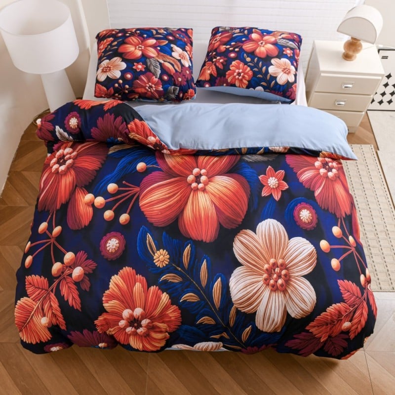 To pościel, która od razu przyciąga uwagę intensywnymi kolorami i nadaje sypialni bardziej wyrazisty, dekoracyjny charakter. Duże kwiaty w odcieniach koralu, ceglanej czerwieni, kremu i granatu pięknie odcinają się od ciemnego tła, dzięki czemu całość wygląda elegancko, ale nie jest ciężka wizualnie, dlatego ten komplet dobrze sprawdzi się zarówno we własnej sypialni, jak i jako prezent.🎁.