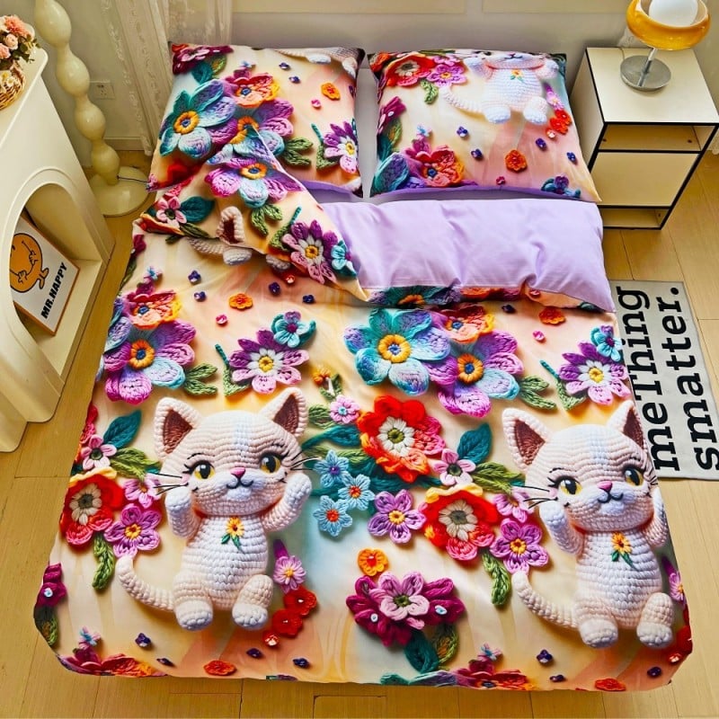 Przenieś swoją sypialnię w zupełnie nowy wymiar dzięki tej innowacyjnej pościeli. To nie jest zwykły nadruk – to rewolucyjna technologia 5D, która tworzy niesamowite złudzenie optyczne, ożywiając wzory jak nigdy dotąd. Głównym motywem jest uroczy, "dziergany" kotek, który wygląda, jakby naprawdę leżał na Twoim łóżku. Otaczają go trójwymiarowe, "szydełkowe" kwiaty i liście, które zdają się wystawać ponad powierzchnię materiału. Każdy splot włóczki i każdy cień zostały oddane z hiperrealistyczną precyzją. Idealny wybór dla siebie lub na prezent🎁.