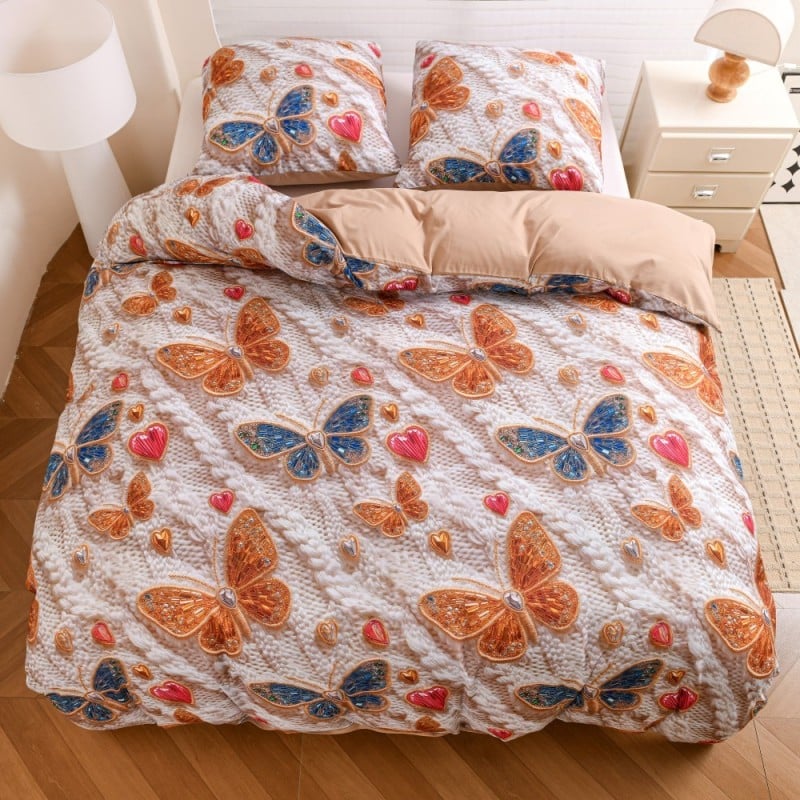 To pościel, która od razu przyciąga uwagę i nadaje sypialni cieplejszy, bardziej dekoracyjny wygląd. Jasne tło połączone z motywem motyli i serc tworzy wzór, który wygląda oryginalnie i bardzo efektownie, dlatego ten komplet dobrze sprawdzi się zarówno we własnej sypialni, jak i jako prezent.🎁.