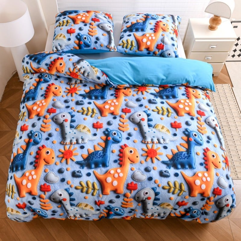- Efekt 5D: Nowoczesny nadruk nadaje wzorowi głębi i sprawia, że dinozaury oraz dekoracyjne elementy wyglądają bardzo efektownie na całej powierzchni pościeli. Kompozycja od razu przyciąga wzrok i nadaje łóżku bardziej bajkowy charakter.