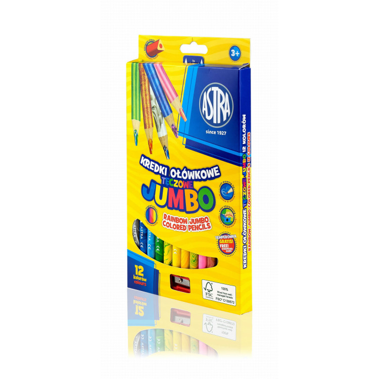 Niezwykle tęczowe kolory umożliwiające tworzenie efektownych prac to cechy charakterystyczne ołówkowych kredek Jumbo. Kredki są miękkie w użyciu i gwarantują bezproblemowe temperowanie.