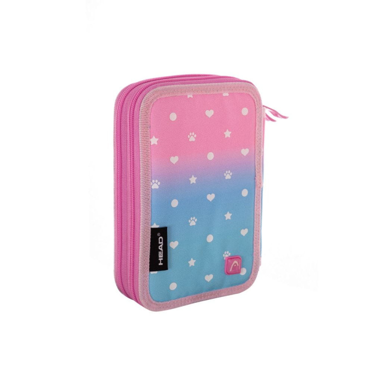 Dwukomorowy piórnik Head w niebiesko-różowej kolorystyce ombre przeplatanej wzorem z białych serduszek i psich łapek. Skradnie serce niejednej romantyczki. Piórnik Head nie posiada wyposażenia. Jednak dzięki pojemnym dwóm komorom pomieści niezbędne przybory w tym kredki, flamastry, ołówki, długopisy i linijki.