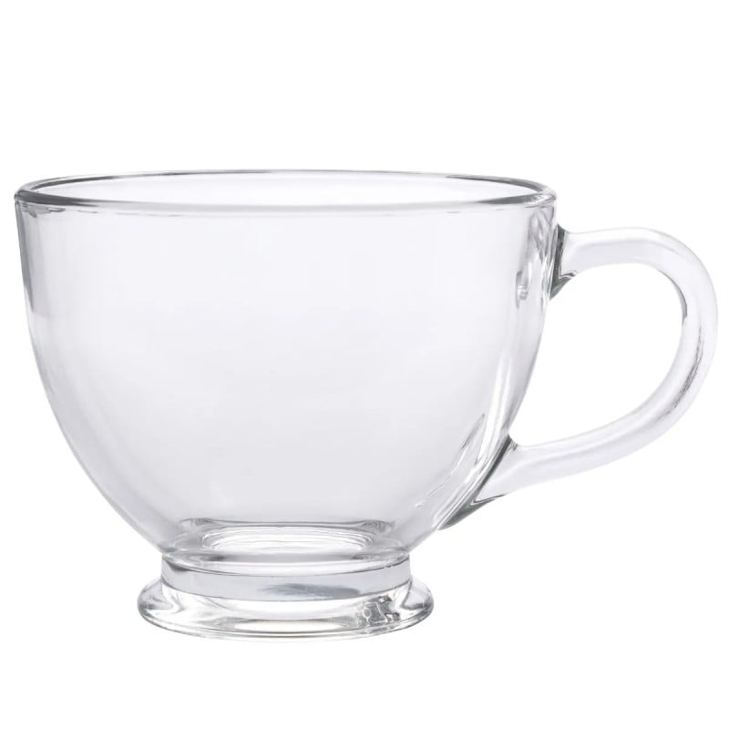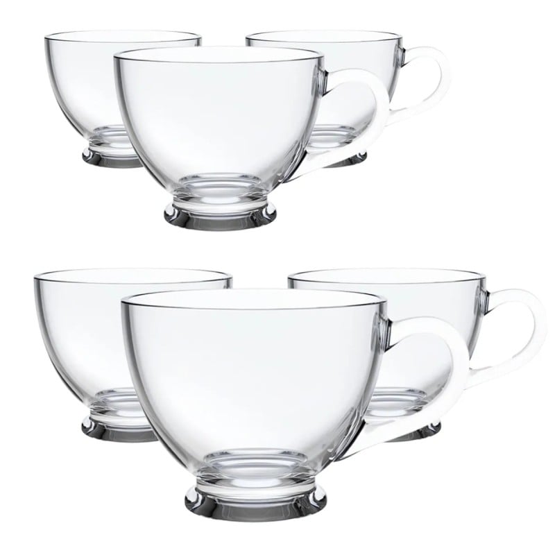 Klasyczny zestaw pojemnych filiżanek ze szkła o uniwersalnej formie. Transparentne ścianki podkreślają kolor napoju, a stabilna stopka i wygodne ucho zwiększają komfort użytkowania. Sprawdzą się w codziennym serwowaniu kawy, herbaty i naparów oraz podczas spotkań przy stole.