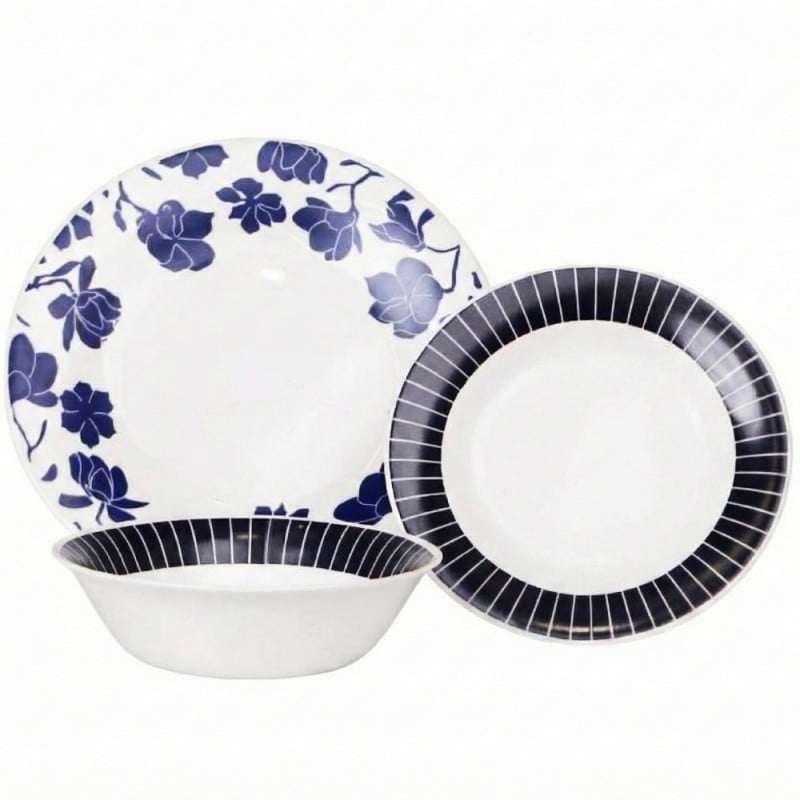 Zestaw obiadowy Bestler 18 elementów – szkło opalowe, motyw niebieskie kwiaty i czarne paski