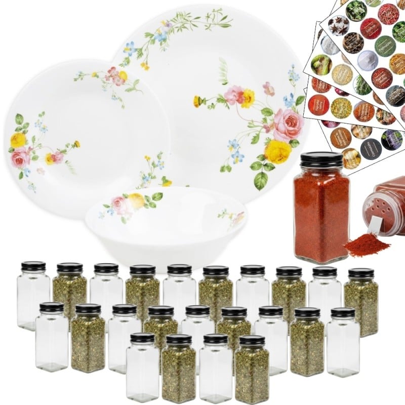 Zestaw obiadowy XXL Serwis obiadowy 18 elementów przyprawniki 24 elementy i naklejki 96 sztuk talerze ze słoiczkami do przypraw