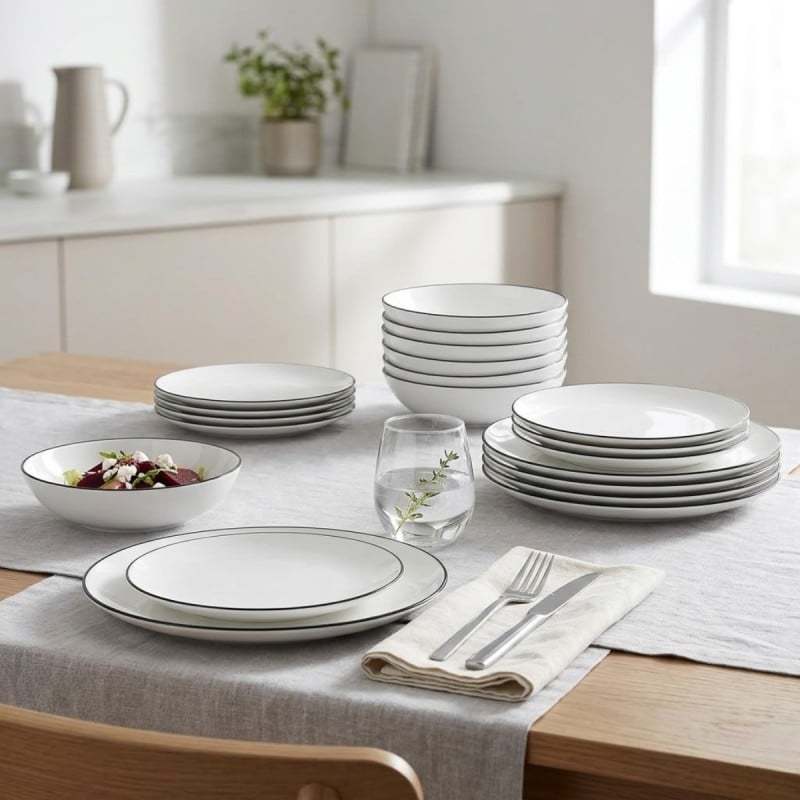 Zestaw obiadowy Linea pozwoli Ci zaprezentować się z klasą podczas każdego obiadu. Wykonany jest z najwyższej jakości porcelany, z nowoczesnym wzornictwem! Jest to kompletny zestaw, który zaspokoi potrzeby każdej rodziny. Niezależnie od tego, czy serwujesz główne dania, aromatyczne zupy czy słodkie desery, zestaw obiadowy Linea zadba o styl i estetykę Twojego stołu. Talerze z porcelany są trwałe i łatwe w czyszczeniu, można myć je w zmywarce oraz używać w kuchence mikrofalowej. Postaw na styl i nowoczesne wzornictwo!