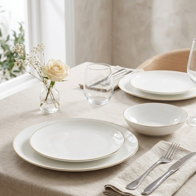 - Śnieżnobiały kolor: Kojąca czysta biel i złoty pasek na rancie idealnie eksponuje wygląd serwowanych potraw,