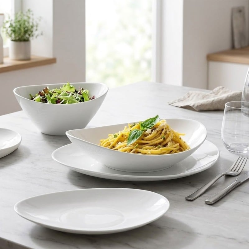 Śnieżnobiały kolor talerzy oraz niebanalny kształt sprawiają, że talerze będą prawdziwą ozdobą Twojego stołu!