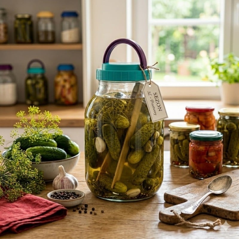 - Pojemność 3 l - duży rozmiar pozwala wygodnie przygotować i przechowywać większą ilość przetworów, kiszonek lub innych domowych produktów.