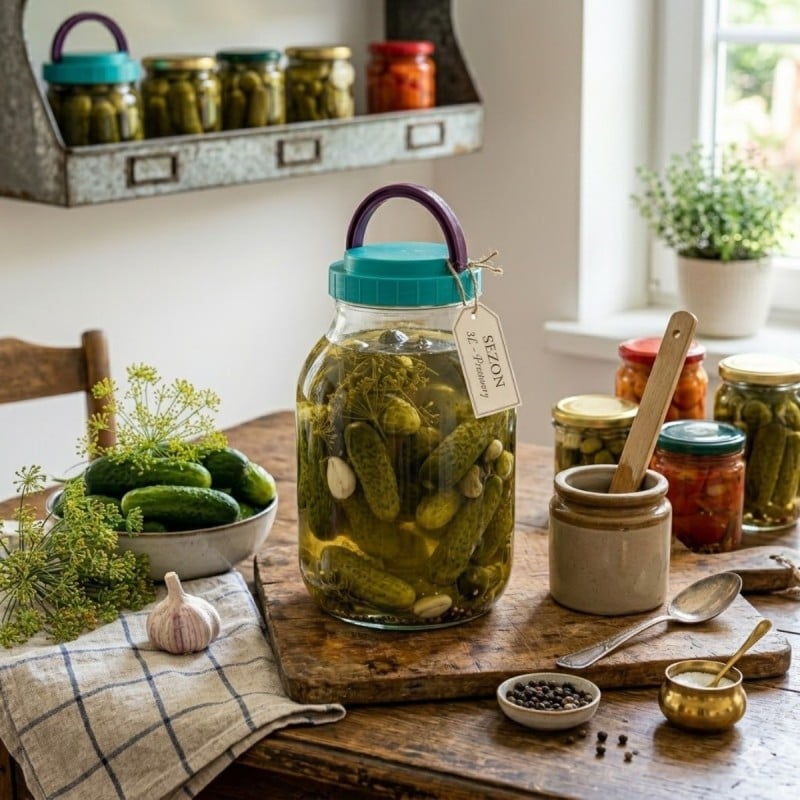 Duży słoik Sezon o pojemności 3 l to praktyczne rozwiązanie do przygotowywania i przechowywania domowych przetworów oraz kiszonek. Solidna szklana forma, wygodna zakrętka i dołączone szczypce sprawiają, że zestaw dobrze sprawdza się przy codziennym użytkowaniu w kuchni i spiżarni. To funkcjonalny pojemnik dla osób, które przygotowują większe partie ogórków, warzyw i innych domowych zapasów.