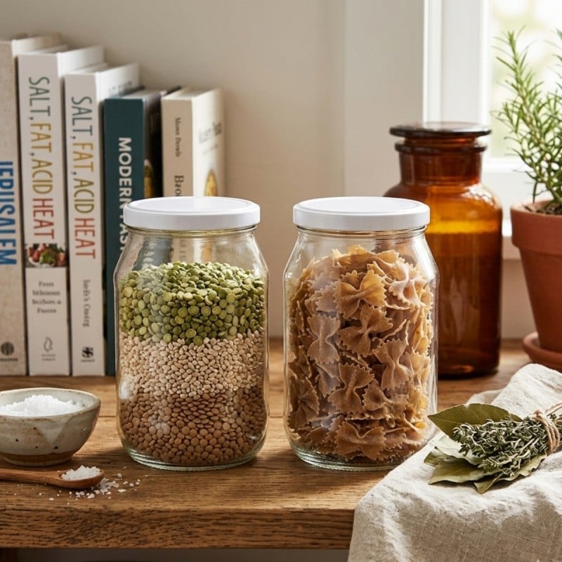 Metalowe zakrętki 6-zaczepowe pomagają szczelnie zabezpieczyć zawartość, co ma znaczenie przy przechowywaniu przetworów i innych produktów spożywczych. Całość tworzy funkcjonalny komplet do codziennego użytku w kuchni i spiżarni.