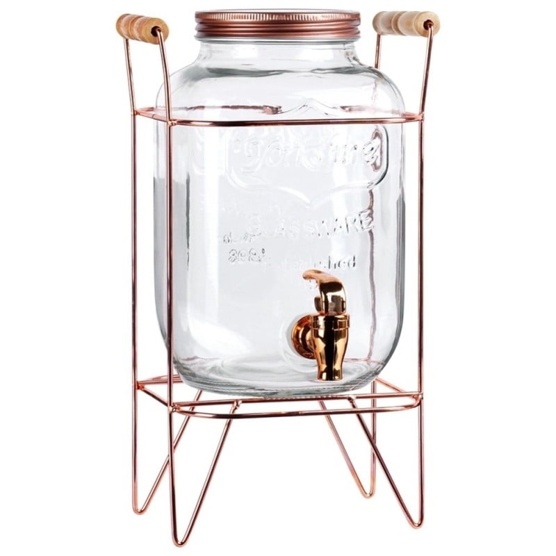 Szklany słój z kranikiem i stojakiem w kolorze złotym to praktyczne rozwiązanie do serwowania lemoniady, soku, ponczu i innych zimnych napojów. Pojemność 4,2 l, wygodny kranik oraz stabilny stojak sprawiają, że zestaw dobrze sprawdza się podczas spotkań w ogrodzie, przyjęć domowych i rodzinnych uroczystości. To funkcjonalny dystrybutor, który ułatwia nalewanie napojów i jednocześnie efektownie prezentuje się na stole.