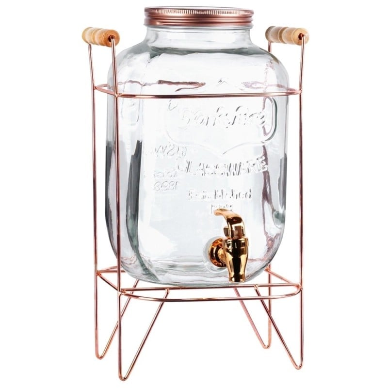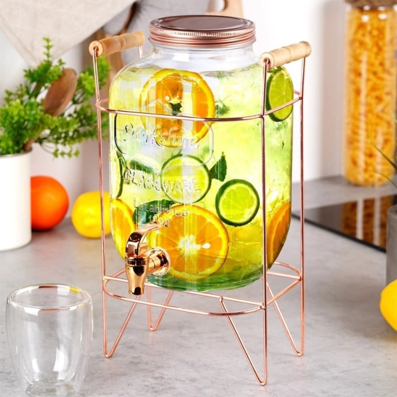 Szklany słój z kranikiem i stojakiem w kolorze złotym to praktyczne rozwiązanie do serwowania lemoniady, soku, ponczu i innych zimnych napojów. Pojemność 4,2 l, wygodny kranik oraz stabilny stojak sprawiają, że zestaw dobrze sprawdza się podczas spotkań w ogrodzie, przyjęć domowych i rodzinnych uroczystości. To funkcjonalny dystrybutor, który ułatwia nalewanie napojów i jednocześnie efektownie prezentuje się na stole.