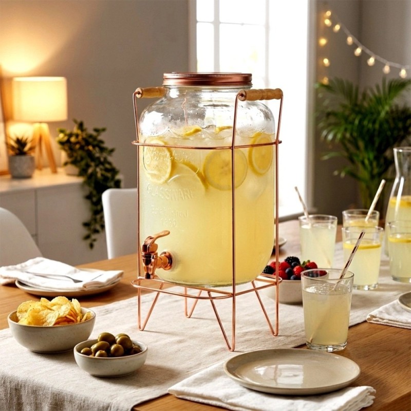Duży słój z kranikiem i stojakiem o pojemności 8 l to wygodny sposób na efektowne serwowanie lemoniady, soku, ponczu i innych zimnych napojów. Dzięki stojakowi nalewanie jest prostsze, a zamykana pokrywa pomaga chronić zawartość przed owadami i zanieczyszczeniami. To praktyczny zestaw na ogród, przyjęcia domowe i różne spotkania, podczas których liczy się wygoda oraz estetyka podania.