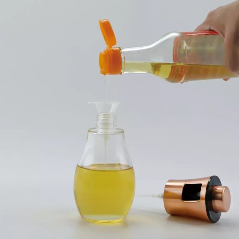 Elegancki spryskiwacz do oliwy i octu to praktyczne akcesorium, które ułatwia precyzyjne dozowanie płynnych przypraw i jednocześnie stanowi stylowy element kuchni. Połączenie szkła i metalicznego wykończenia w kolorze różowego złota sprawia, że dobrze prezentuje się zarówno na blacie, jak i na stole.