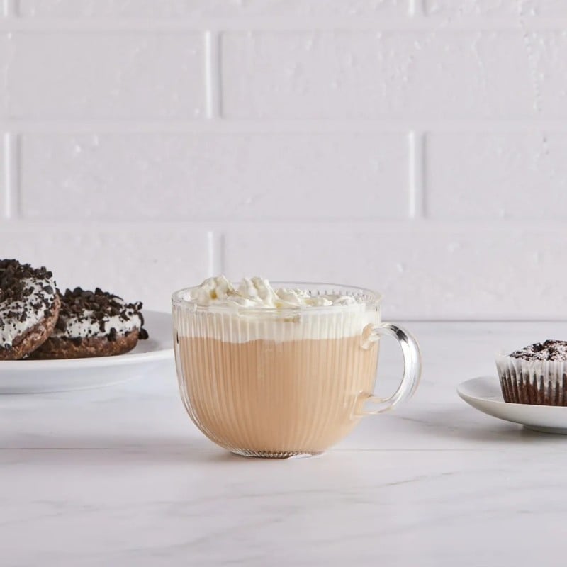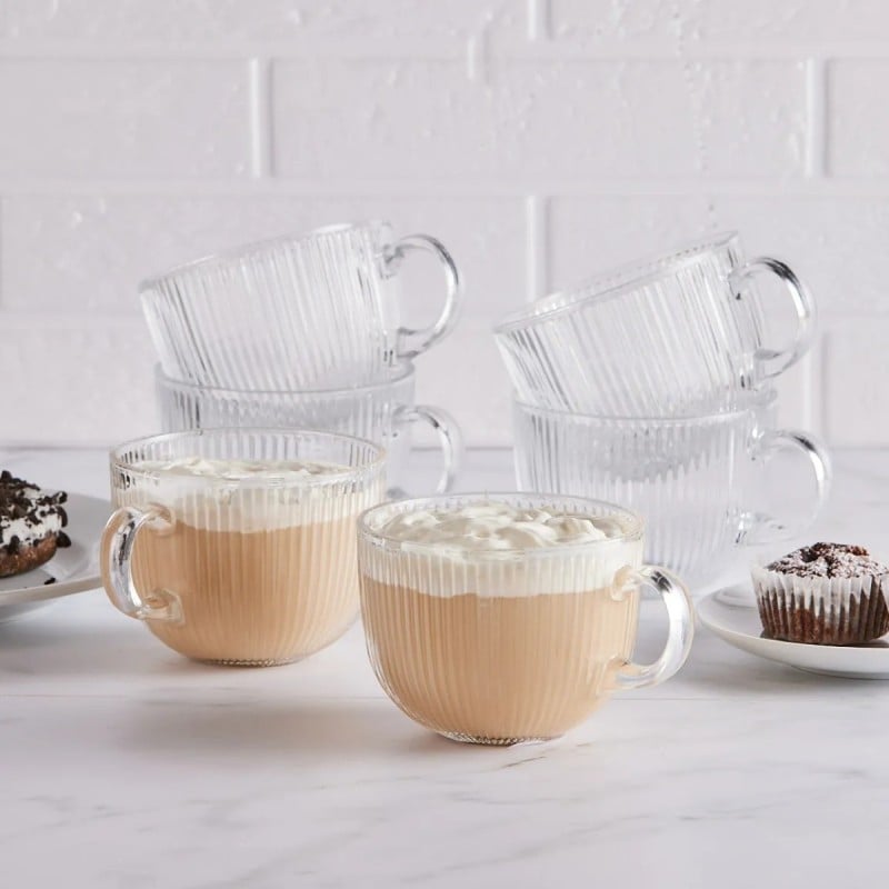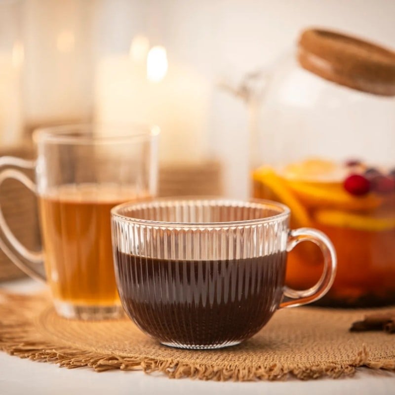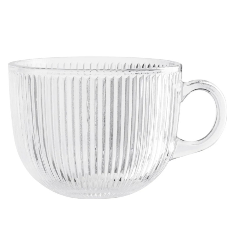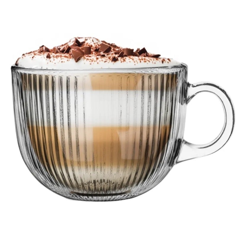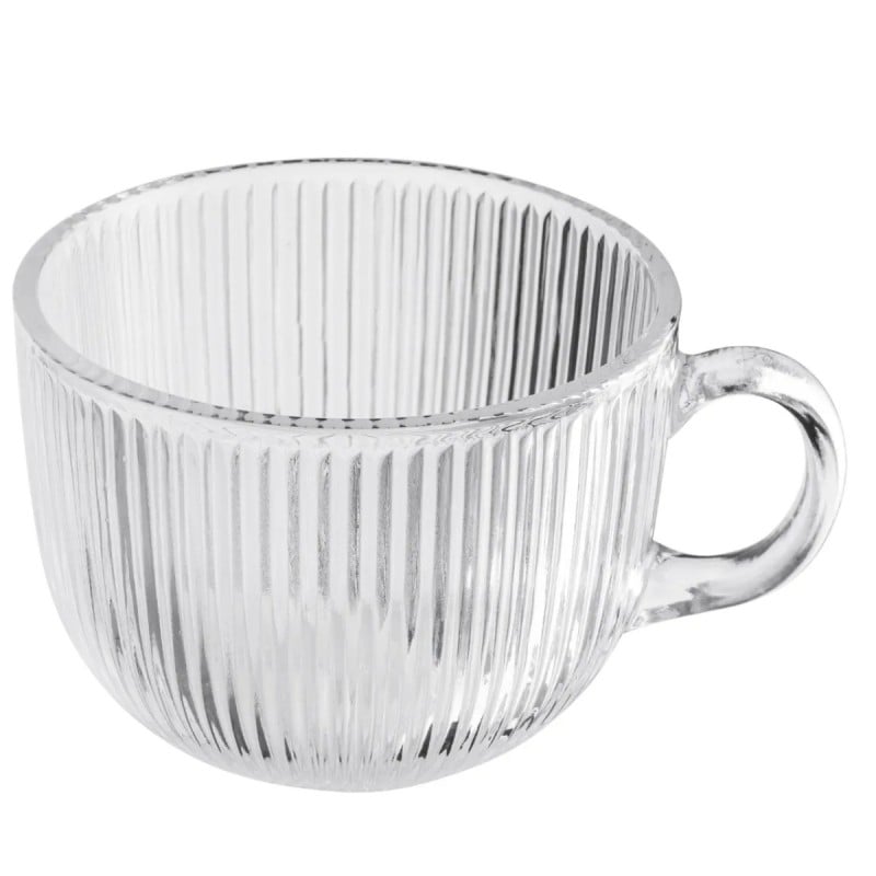 To filiżanki dla tych, którzy lubią duże porcje kawy i herbaty bez kompromisów w wyglądzie. Przezroczyste, ryflowane szkło i solidna forma sprawiają, że napój prezentuje się elegancko, a jednocześnie można się nim spokojnie delektować bez ciągłego dolewania.