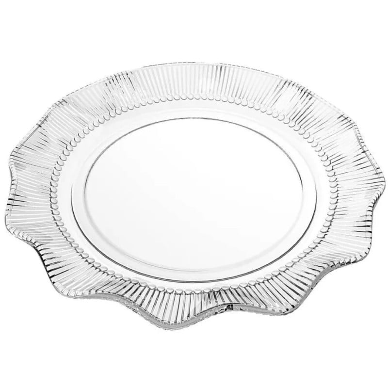 Wprowadź do swojej jadalni odrobinę klasyki z nutą finezyjnej elegancji – komplet 6 szklanych talerzy Vivienne to wybór, który łączy dekoracyjność z codzienną funkcjonalnością. Każdy z talerzy ma średnicę 17,5 cm i zachwyca subtelnym, promienistym tłoczeniem oraz falowanym brzegiem, który pięknie odbija światło i przyciąga spojrzenia. Transparentne szkło o wysokiej przejrzystości pasuje do każdego stylu wnętrza – od klasycznego po nowoczesny.