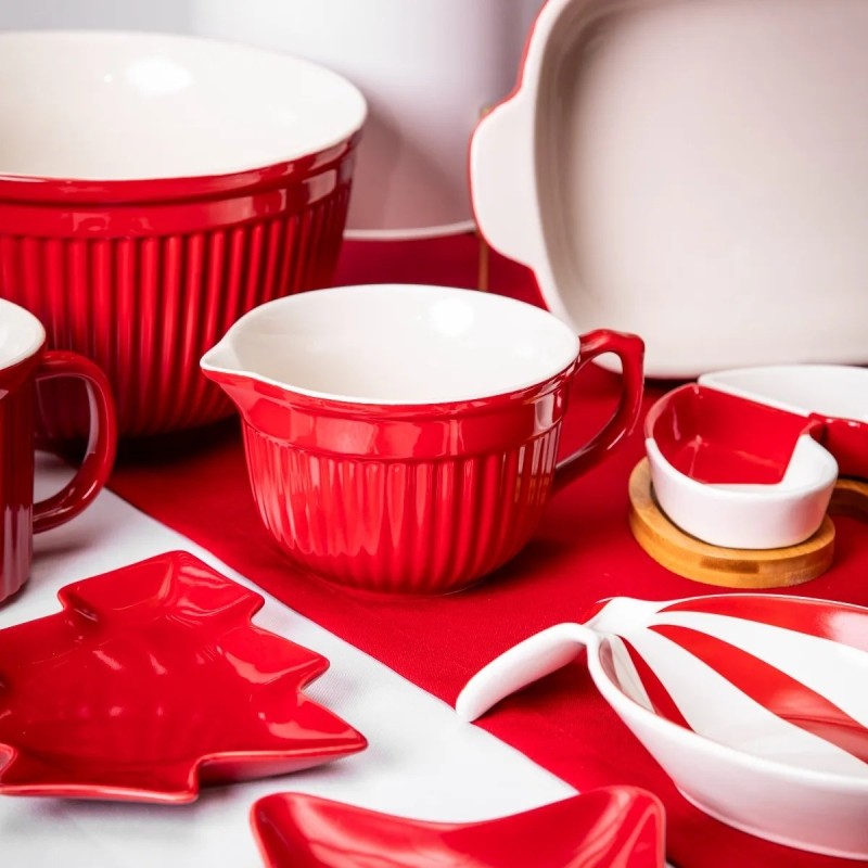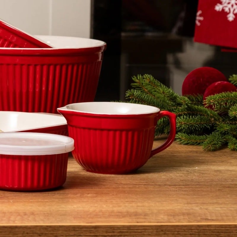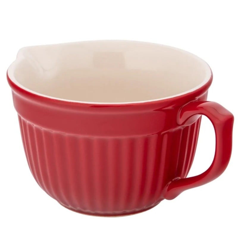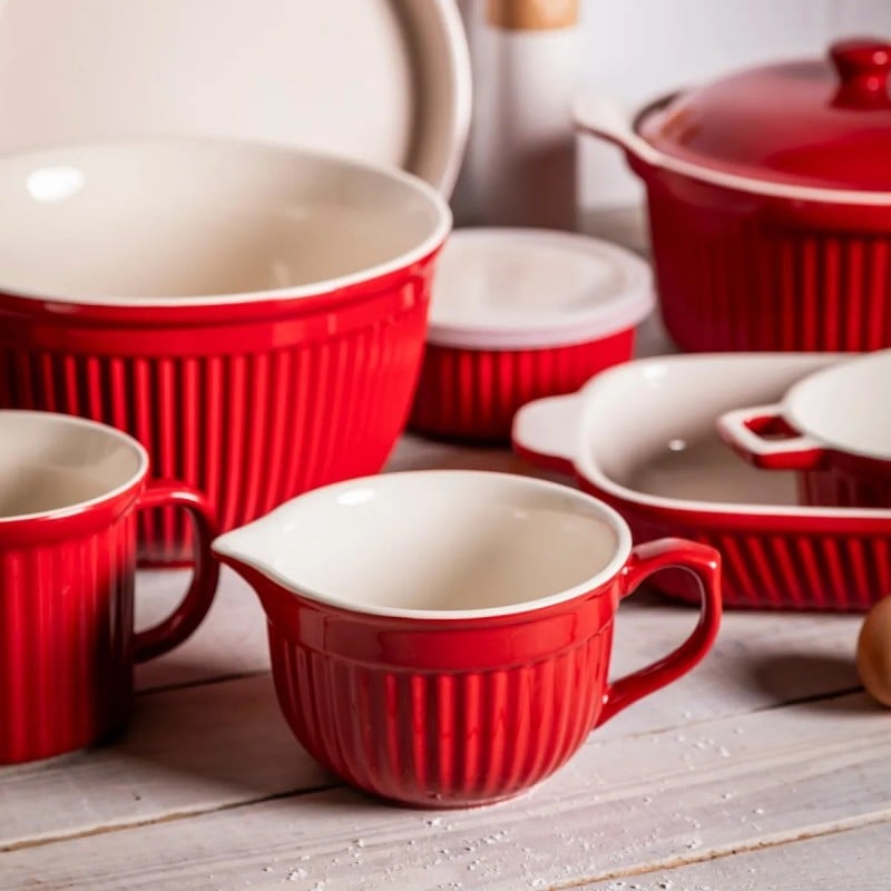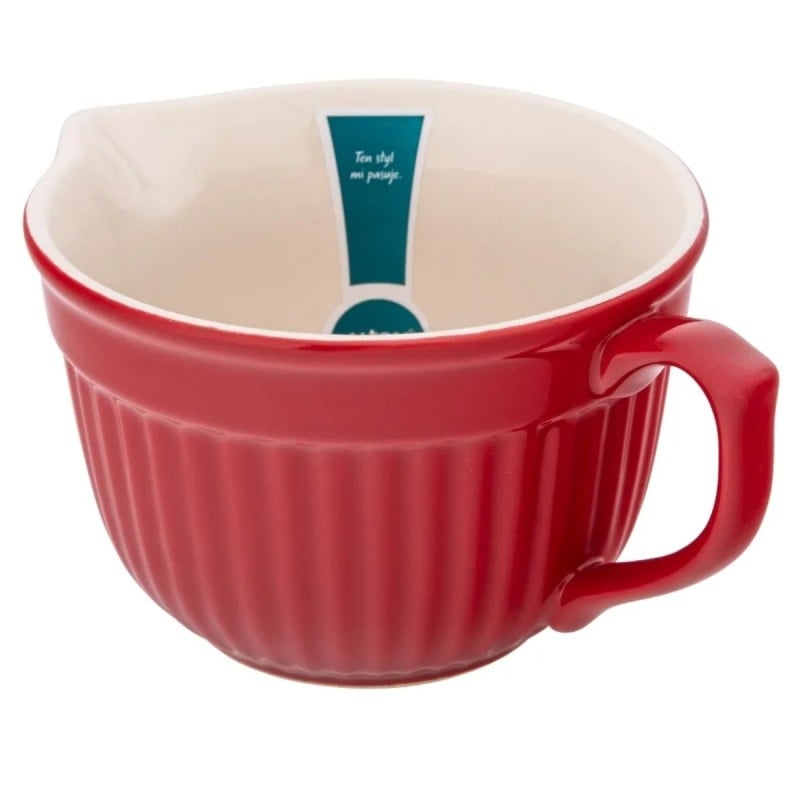 Mała, poręczna i od razu rzuca się w oczy. Intensywna czerwień i charakterystyczna faktura sprawiają, że to naczynie nie ginie w kuchni, a przy okazji jest po prostu wygodne w użyciu. Idealna wtedy, gdy chcesz coś wymieszać, przelać albo podać bez bałaganu na blacie.