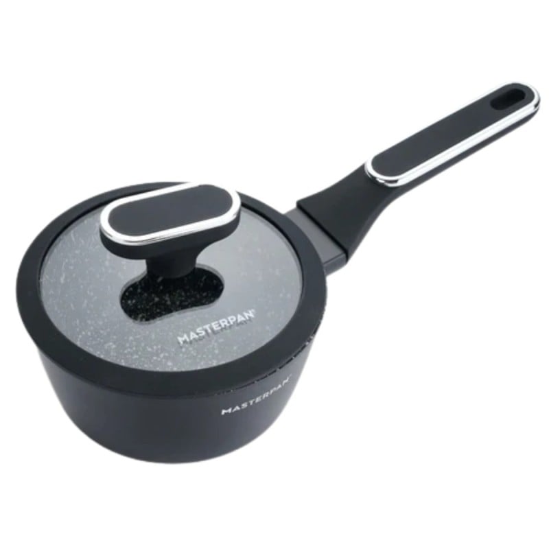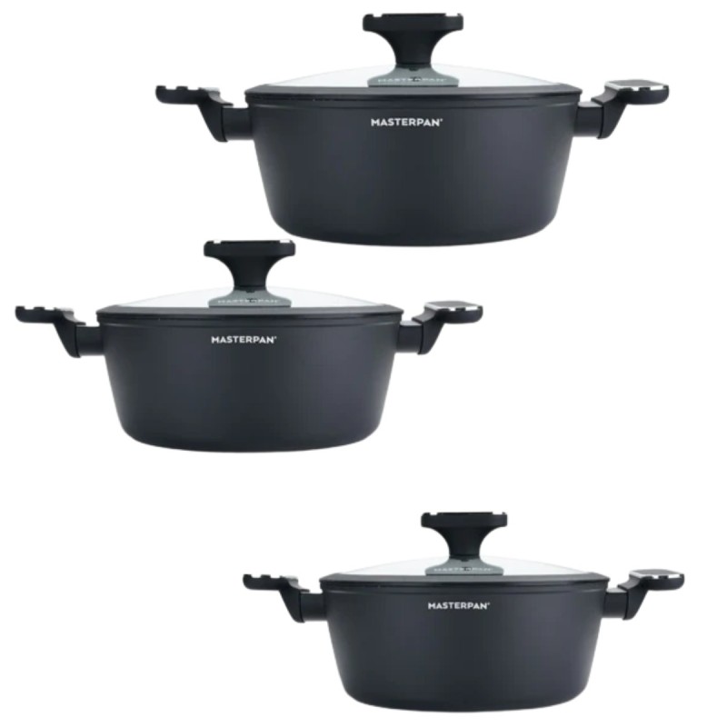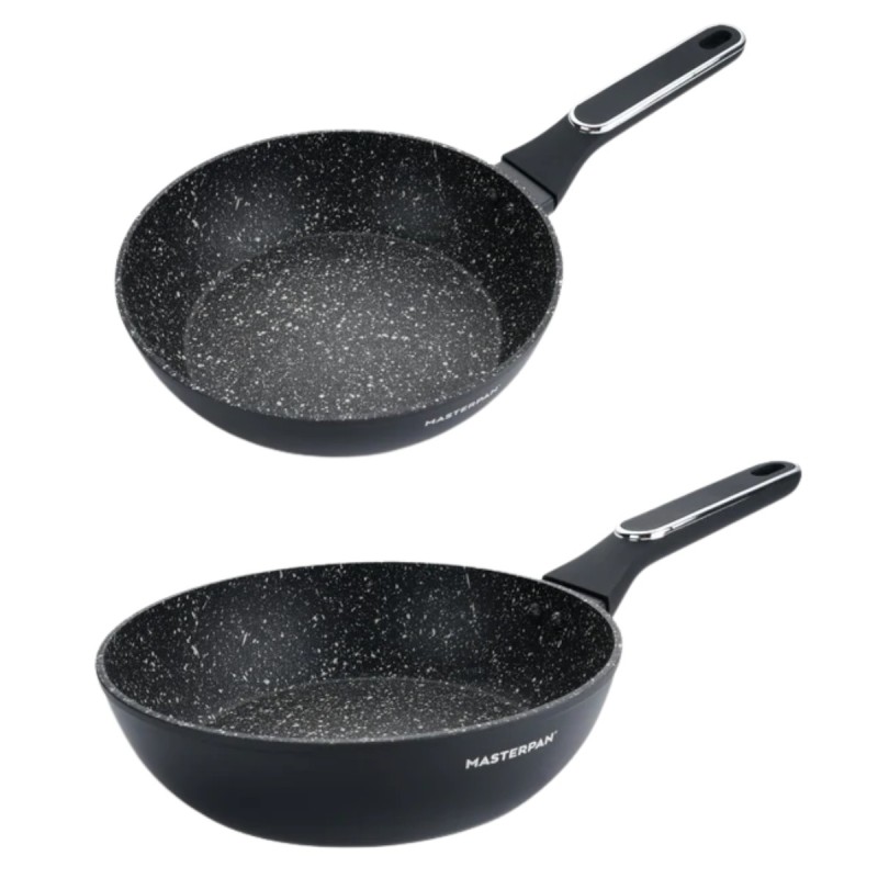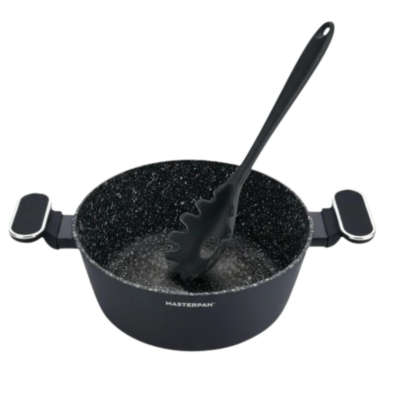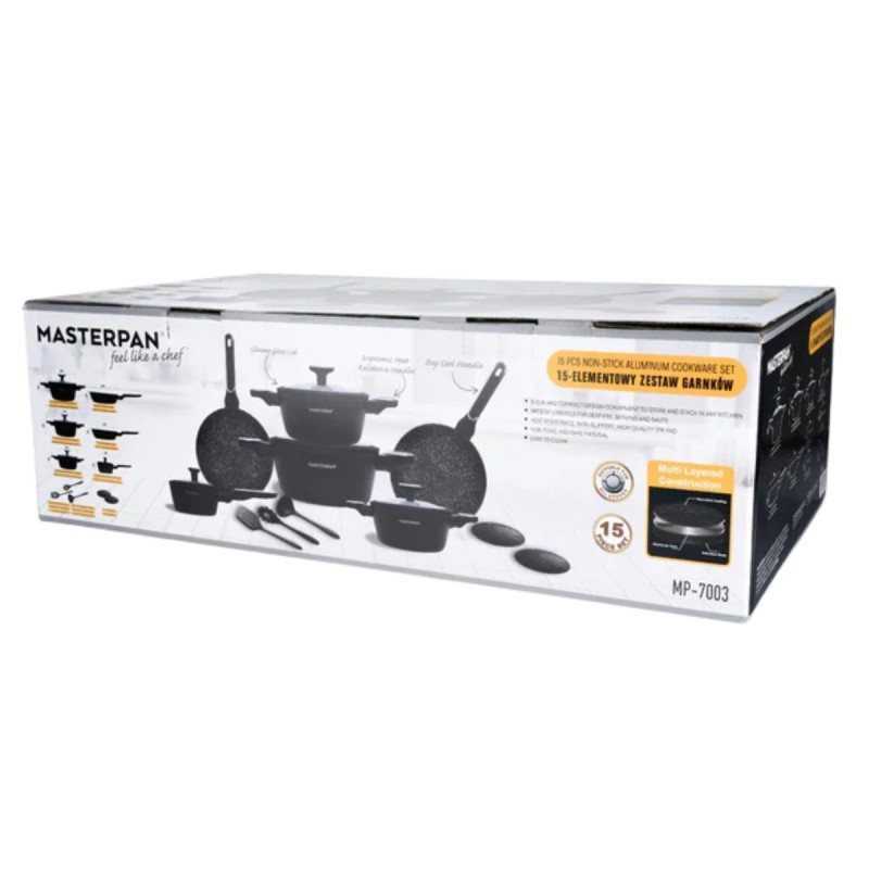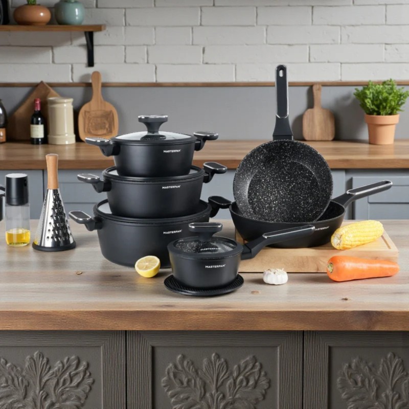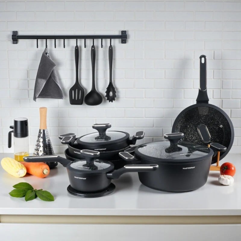Zestaw garnków marmurkowych czarnych z powłoką granitową 15 el. komplet z patelniami wraz z rondlem i przyborami MasterPan