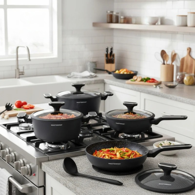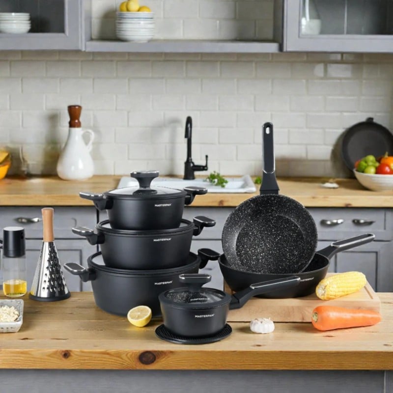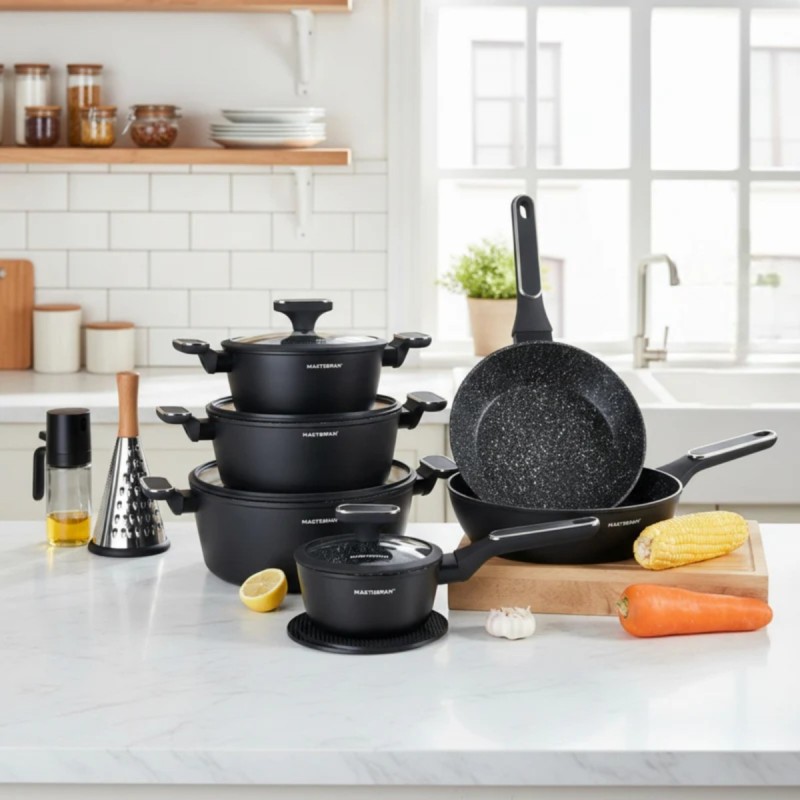 Ten zestaw został zaprojektowany z myślą o osobach, które chcą mieć w kuchni komplet solidnych naczyń do codziennego gotowania, bez kompromisów między wyglądem a funkcjonalnością. Kute aluminium, marmurowe wykończenie w czarnym kolorze i przemyślana konstrukcja sprawiają, że to zestaw, który dobrze wygląda i jeszcze lepiej pracuje na każdym typie kuchenki.